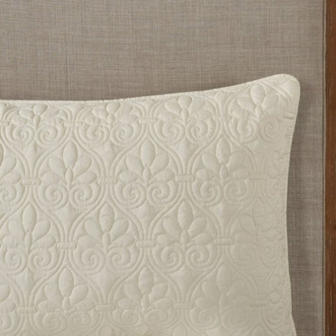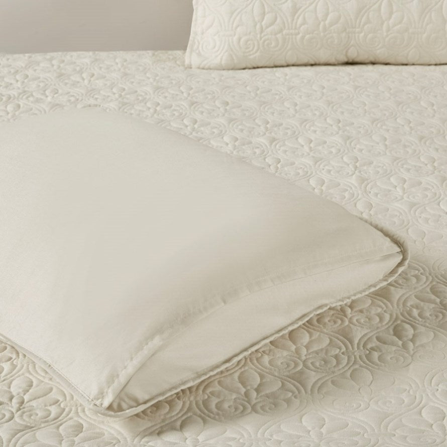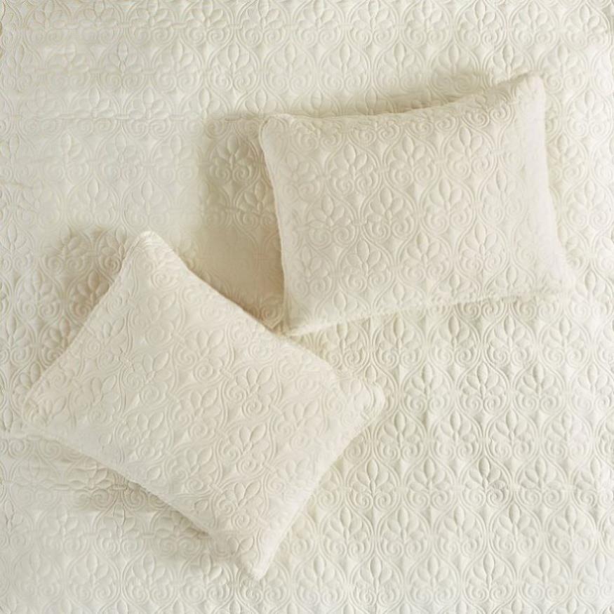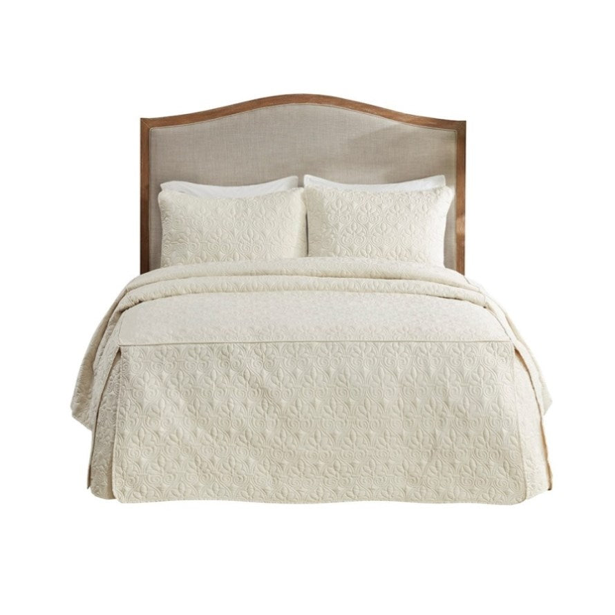 The Madison Park Quebec 3 Piece Quilted Bedspread Set offers a charming cottage-inspired update to your bedroom. The open split-corner bedspread and shams flaunt a classic stitch pattern that creates a rich depth and texture on the face of the bedding set. All-over quilted box sewing keeps the filling secure, while the 24-inch drop sides create a clean draped look with pleated corners. It is available in four different colors including a soft cream, dark grey, rich taupe, and vibrant navy. This fitted bedspread also has an antimicrobial treatment that provides built-in freshness protection, reducing the growth of odor causing bacteria to keep fabric lasting longer.
