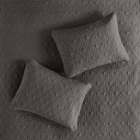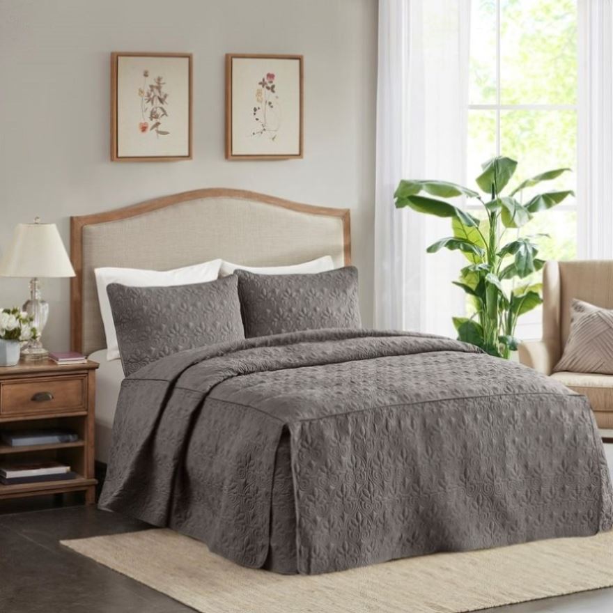 The Madison Park Quebec 3 Piece Quilted Bedspread Set offers a charming cottage-inspired update to your bedroom. The open split-corner bedspread and shams flaunt a classic stitch pattern that creates a rich depth and texture on the face of the bedding set. All-over quilted box sewing keeps the filling secure, while the 24-inch drop sides create a clean draped look with pleated corners. It is available in four different colors including a soft cream, dark grey, rich taupe, and vibrant navy. This fitted bedspread also has an antimicrobial treatment that provides built-in freshness protection, reducing the growth of odor causing bacteria to keep fabric lasting longer.