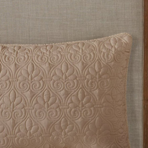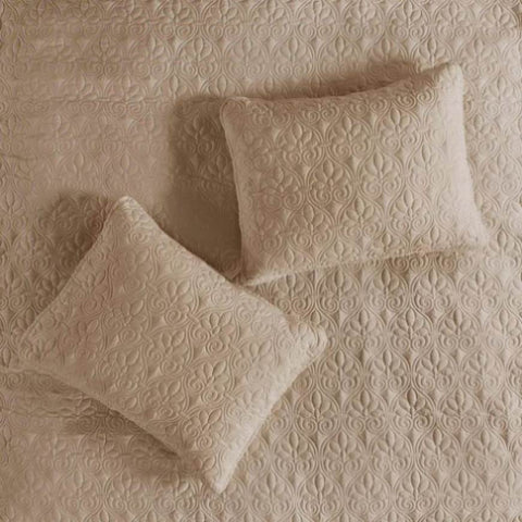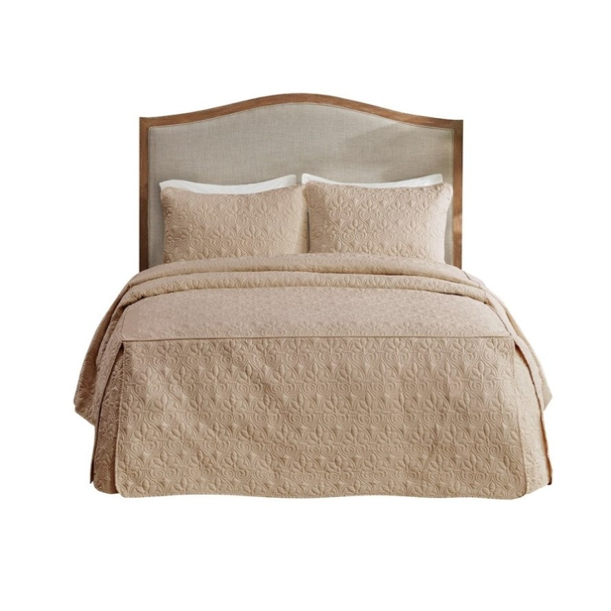 The Madison Park Quebec 3 Piece Quilted Bedspread Set offers a charming cottage-inspired update to your bedroom. The open split-corner bedspread and shams flaunt a classic stitch pattern that creates a rich depth and texture on the face of the bedding set. All-over quilted box sewing keeps the filling secure, while the 24-inch drop sides create a clean draped look with pleated corners. It is available in four different colors including a soft cream, dark grey, rich taupe, and vibrant navy. This fitted bedspread also has an antimicrobial treatment that provides built-in freshness protection, reducing the growth of odor causing bacteria to keep fabric lasting longer.