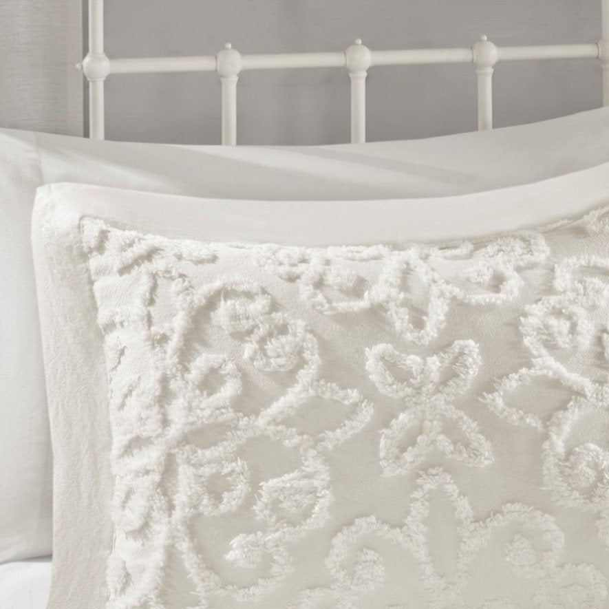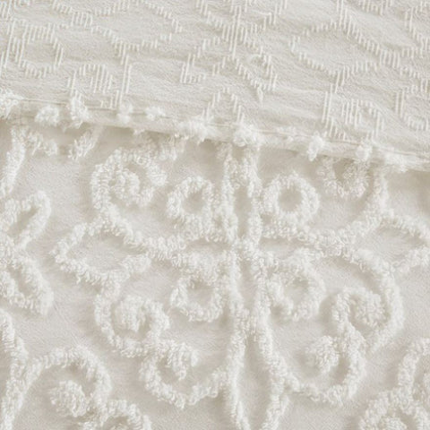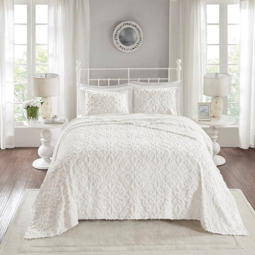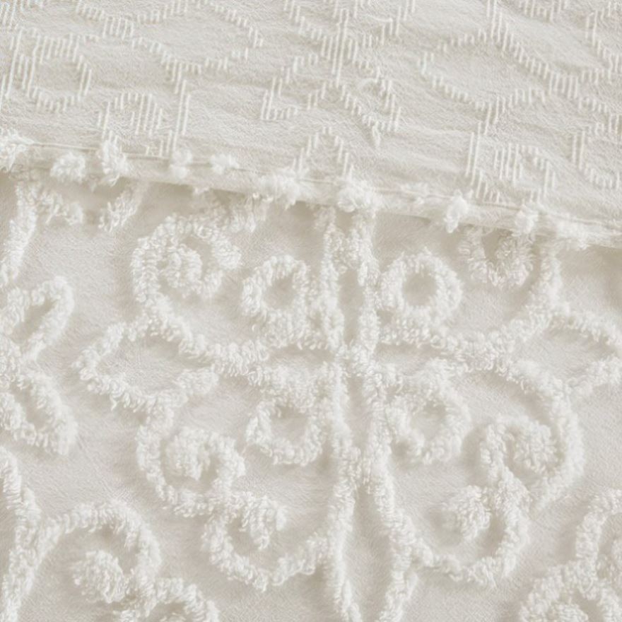 Give your bedroom a cozy shabby chic look with the Madison Park Sabrina 3 Piece Tufted Cotton Chenille Bedspread Set. The cotton chenille bedspread and shams flaunt a tufted floral medallion motif, creating a charming farmhouse look. This oversized bedspread is also unfilled for lightweight coverage and is perfect for summer use or as an added layer for the cold season. Made with a 100% cotton face and reverse, this tufted cotton bedspread set offers a shabby chic update for your bedroom. This bedding set is also OEKO-TEX certified, meaning it does not contain any harmful substances or chemicals to ensure quality comfort and wellness. Due to the nature of the chenille fabric, some shedding will occur naturally in the first 3-4 washes.