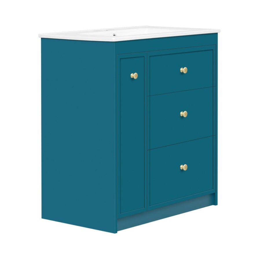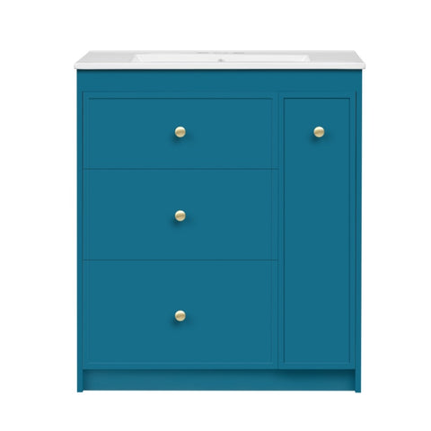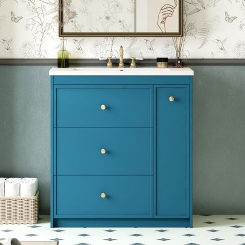 This 30-inch bathroom cabinet brings a touch of freshness and tranquility to your bathroom with its elegant blue hue. The design is simple yet stylish, and the cabinet is made of high-quality materials to ensure durability and waterproof performance. Four spacious drawers provide ample storage space for you to sort and store toiletries, towels and other bathroom necessities. Each drawer is equipped with a smooth guide rail for easy opening and closing. The cabinet surface is flat and smooth, easy to clean, and keeps the bathroom tidy. Whether it is a modern style or a traditional decoration, this bathroom cabinet can be perfectly integrated to enhance the beauty and practicality of the overall space.