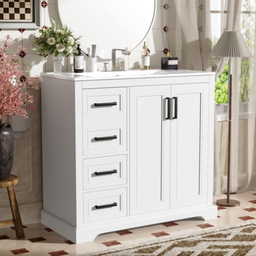 Upgrade your bathroom with this 36" modern vanity in a crisp white finish, paired with a durable ceramic sink. Designed for both style and functionality, it features 3 drawers, an adjustable shelf, and spacious under-sink storage to keep your essentials organized. Soft-close doors ensure a quiet and smooth experience, while high-quality materials provide long-lasting durability. Perfect for medium to small bathrooms, this vanity enhances your space with elegance and efficiency.