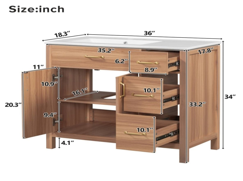 Perfect Size for Small Bathrooms:This 36"*18.3"*34" vanity is perfectly designed for small bathrooms, offering ample storage without taking up too much space.