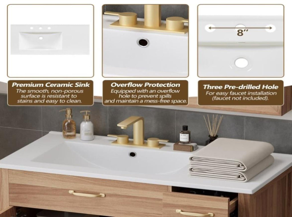 Ceramic Sink for Easy Cleaning:The high-quality ceramic sink features a smooth surface, making it easy to clean and maintain a fresh, tidy look.