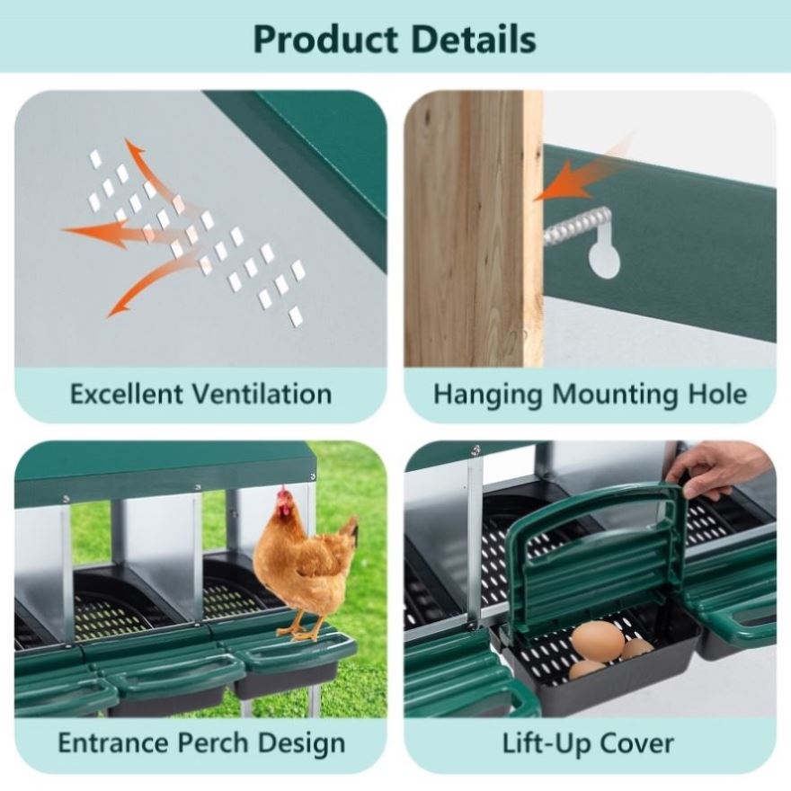 Removable Tray for Easy Clean Simply remove the tray and rinse away any extra waste with water. Keep egg-laying environment of chicken nesting boxes clean and Enjoy hassle-free cleaning.