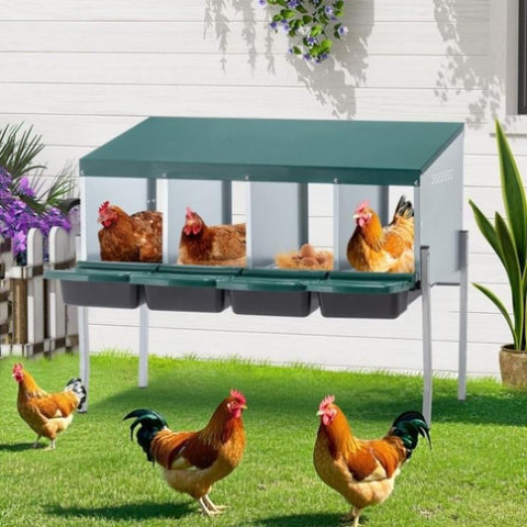 Buit To LastOur chicken nesting boxes are constructed with rugged galvanized steel for both the roof and sides, ensuring long-lasting durability. The boxes are designed to withstand the elements and are reinforced with holes to keep the hens dry and cool inside.
