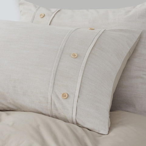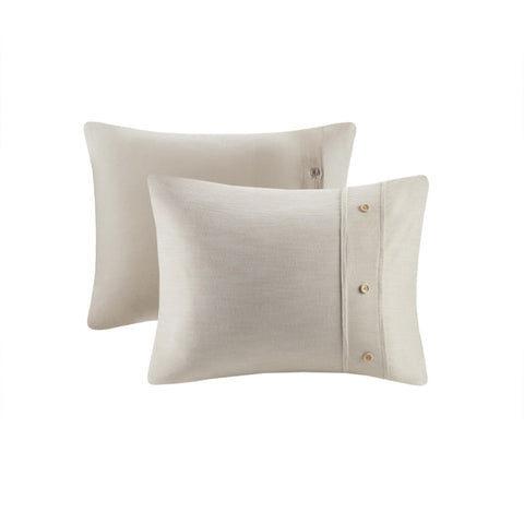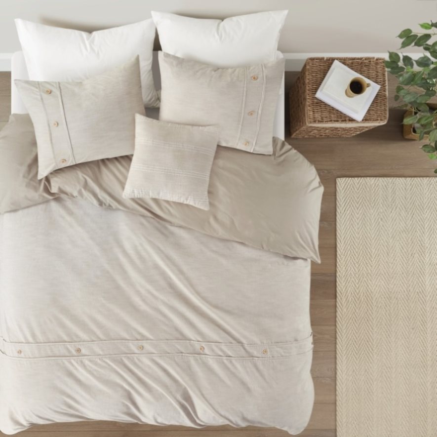 The Clean Spaces Dover 5 Piece Organic Cotton Comforter Cover Set with removable insert offers a refreshing update to your bedroom. This GOTS certified organic cotton comforter cover features button placket details on the soft natural fabric, for a modern farmhouse look. A removable insert is included, and secured by corner ties and a button closure to make washing easier. The 2 matching shams also showcase button placket details that complement the oversized comforter cover, and a decorative pillow completes this bedding set. An antimicrobial treatment provides built-in freshness protection, reducing the growth of odor causing bacteria to keep fabric lasting longer. Items in the set may come in a rolled or compressed packaging, which will need to be fluffed up or steam ironed before use to remove wrinkles.