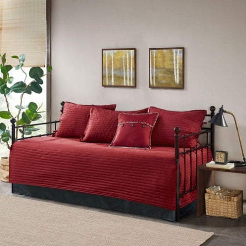 Give your guest bedroom that classic cabin look with the Madison Park Ridge 6 Piece Reversible Daybed Cover Set. This reversible daybed cover features a herringbone style red and black plaid print that flips to a solid red on the reverse, for a casual rustic look. The 3 reversible shams allow you to match with either side of the daybed cover, while a square decorative pillow adds a complementary touch to the top of the bed. A solid black bed skirt completes the lodge style bedding. With a quilted cover and pre-washed cotton-rich filling, this reversible daybed cover set offers a soft and comfortable cabin allure for your guest room. The daybed cover fits a Twin size mattress.