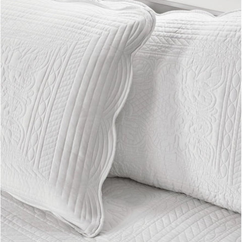 The Madison Park Tuscany 6 Piece Reversible Scalloped Edge Daybed Cover Set offers a charming cottage-inspired update to your guest bedroom. The daybed cover and 3 shams flaunt a classic stitch pattern with scalloped edges that add an elegant touch to your bedroom. A square decorative pillow with elegant embroidery and solid bed skirt add the finishing touches to the daybed set. This country daybed cover also has an antimicrobial treatment that provides built-in freshness protection, reducing the growth of odor causing bacteria to keep fabric lasting longer. The daybed cover easily fits a Twin size mattress. Items in the set may come in a rolled or compressed packaging, which will need to be fluffed up or steam ironed before use to remove wrinkles.
