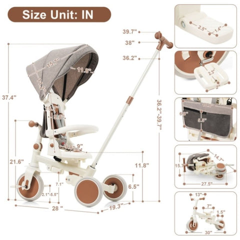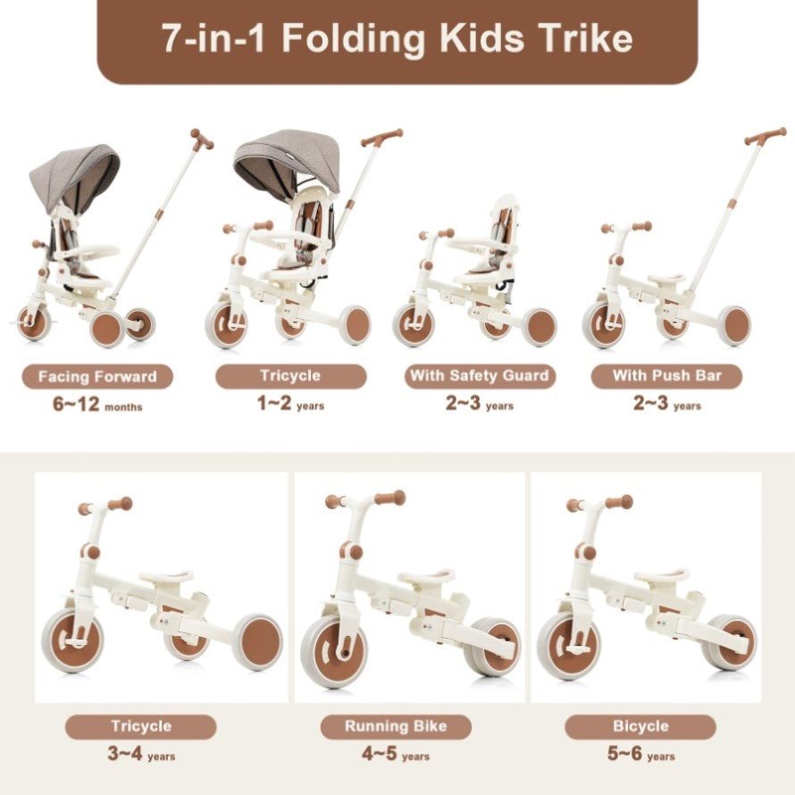 7-in-1 Multifunctional-This baby tricycle can be used as a learn-to-ride trike with a canopy, a push tricycle, a standard tricycle, and a balance bike, which meets the needs of children at different stages of growth from 1 to 6 years old.
