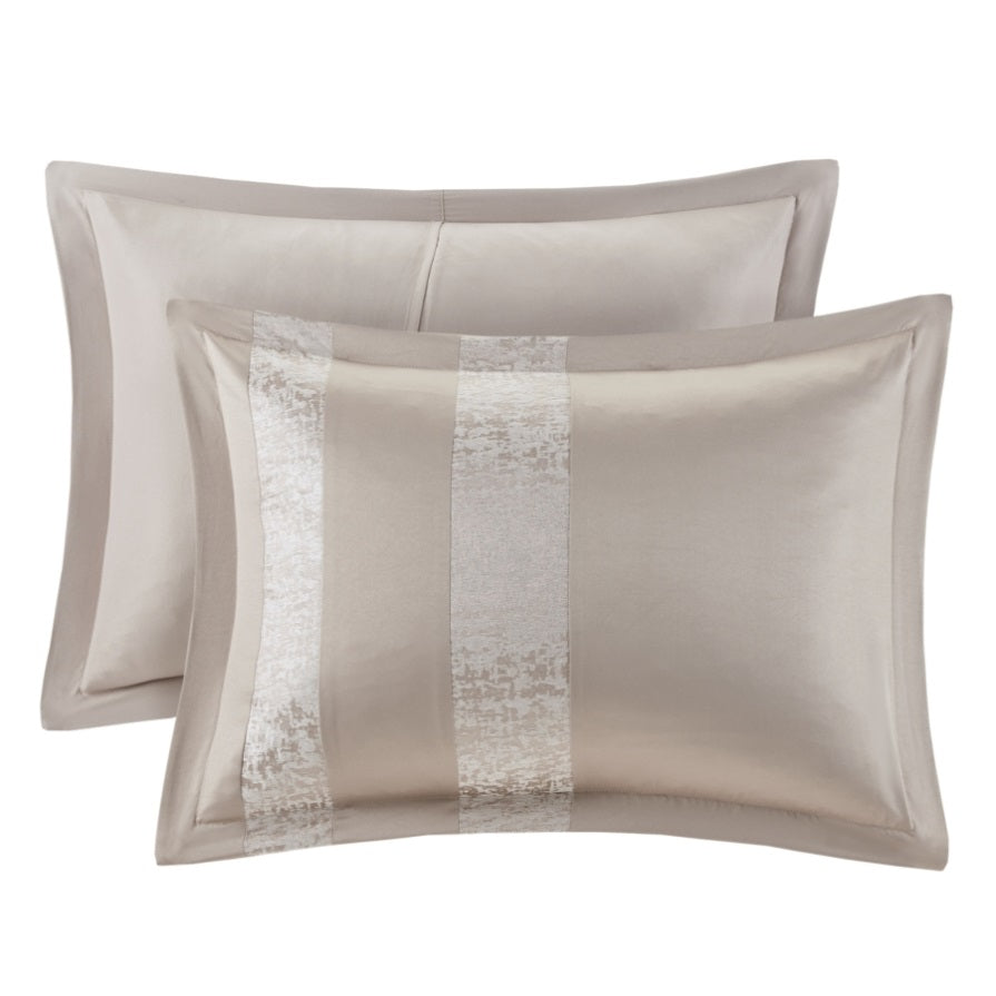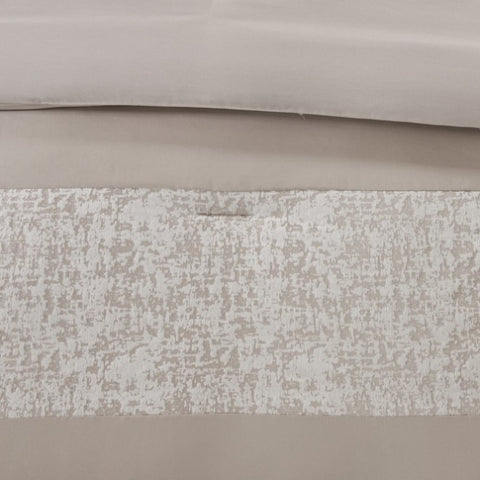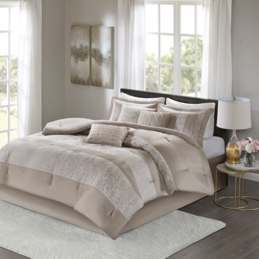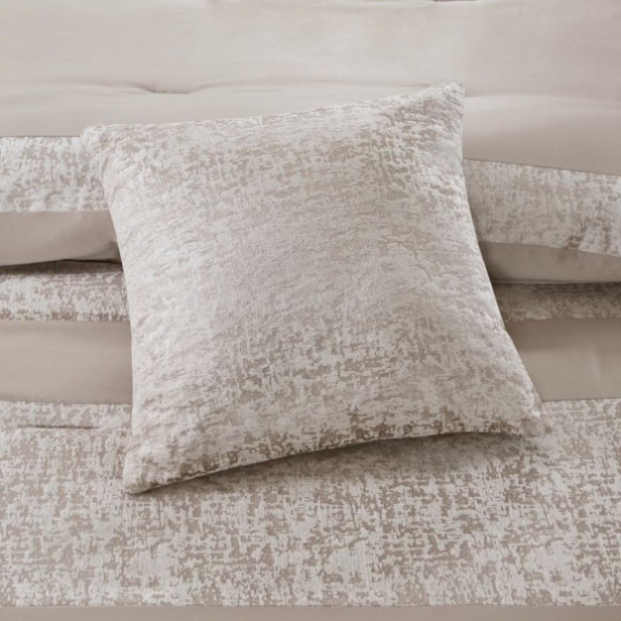 The Madison Park Ava 7 Piece Chenille Jacquard Comforter Set offers a luxurious update to your bedroom décor. The luxurious taupe comforter and shams flaunt a pieced design with stripes of textured chenille jacquard that creates a stunning three dimensional effect. The 2 square decorative pillows and one oblong pillow are stuffed with hypoallergenic filling and feature embroidery and pleating details that provide elegant touches for the top of the bed. A solid taupe bed skirt completes the comforter set, giving the bed a clean finished look. Machine washable for easy care, this chenille jacquard comforter set is machine washable and brings a glamorous allure to your bedroom. Due to the nature of the chenille fabric, some shedding will occur naturally in the first 3-4 washes.