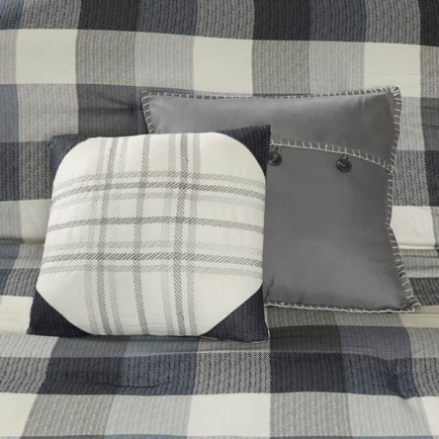For an irresistibly warm and comfortable look, Madison Park’s Ridge 7 Piece Herringbone Comforter Set is the perfect update to your space. This rich comforter sports a bold buffalo plaid pattern that is printed on the herringbone fabric. The striking design gives way to a herringbone printed border at the foot of the bed for additional charm. Coordinating shams mimic the style of the comforter, enhancing the warm and cozy lodge aesthetic. Three decorative pillows with hand-stitched embroidered details bring texture and dimension to the top of the bed, while the herringbone printed bed skirt offers a clean and handsome finish. Items in the set may come in a rolled or compressed packaging, which will need to be fluffed up or steam ironed before use to remove wrinkles.