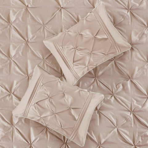 This beautifully tufted bed is from the Laurel Bedding Collection. It’s gorgeous, soft blush color makes this set easy to accessorize your bedroom. The collection is made from 100% polyester polyoni and has pieced fabric sewn together to give this set dimension. It is finished with a smooth edge of fabric that creates a beautiful border around this comforter. Items in the set may come in a rolled or compressed packaging, which will need to be fluffed up or steam ironed before use to remove wrinkles.