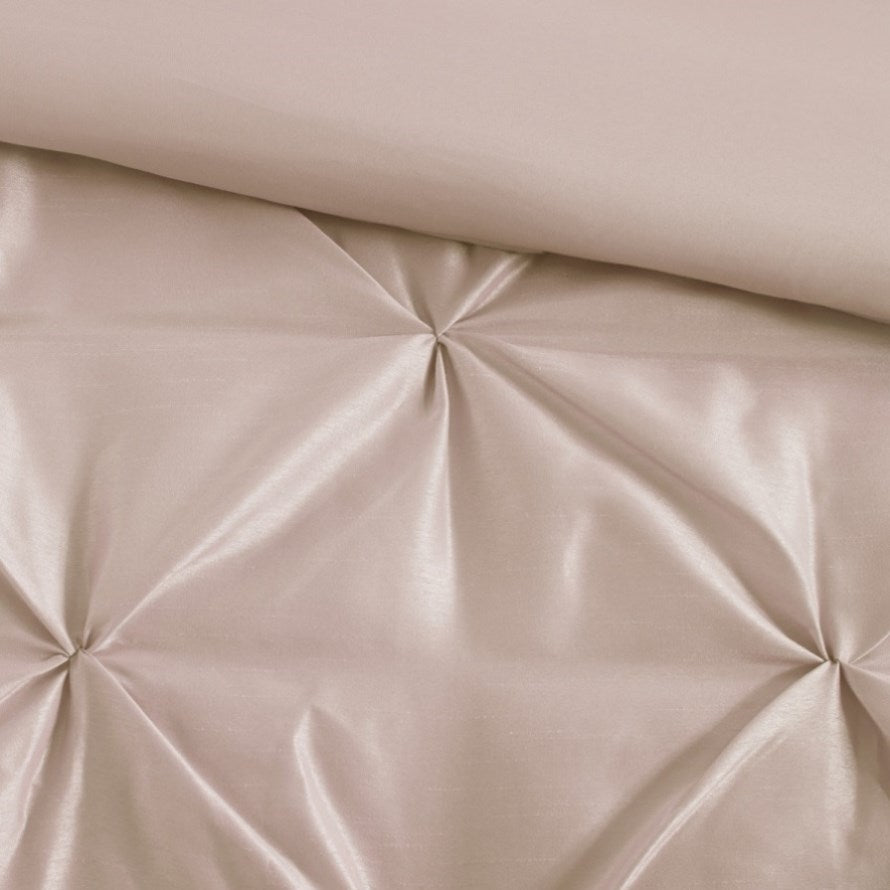 This beautifully tufted bed is from the Laurel Bedding Collection. It’s gorgeous, soft blush color makes this set easy to accessorize your bedroom. The collection is made from 100% polyester polyoni and has pieced fabric sewn together to give this set dimension. It is finished with a smooth edge of fabric that creates a beautiful border around this comforter. Items in the set may come in a rolled or compressed packaging, which will need to be fluffed up or steam ironed before use to remove wrinkles.