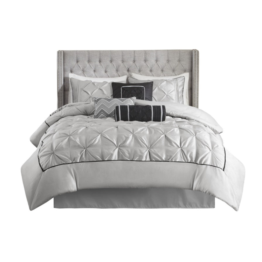 This beautifully tufted bed is from the Laurel bedding collection. Its grey coloring makes this set create a statement in your bedroom. The collection is made from 100% polyester polyoni and has pieced fabric sewn together providing added dimension. It is finished with a smooth edge of fabric that creates a beautiful border around this comforter. Items in the set may come in a rolled or compressed packaging, which will need to be fluffed up or steam ironed before use to remove wrinkles.