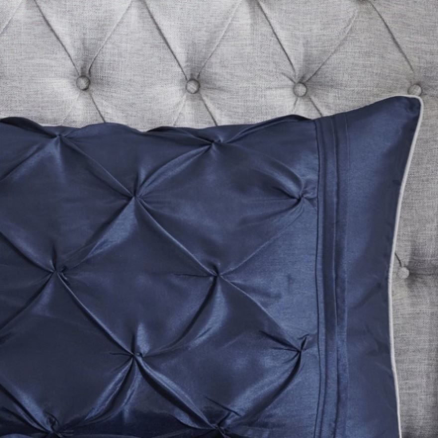 This beautifully tufted bed is from the Laurel bedding collection. Its deep navy coloring makes this set create a statement in your bedroom. The collection is made from 100% polyester polyoni and has pieced fabric sewn together to give this set dimension. It is finished with a smooth edge of fabric that creates a beautiful border around this comforter. Items in the set may come in a rolled or compressed packaging, which will need to be fluffed up or steam ironed before use to remove wrinkles.