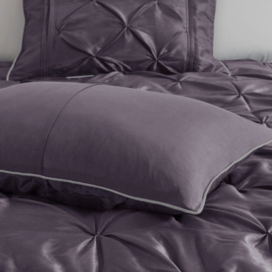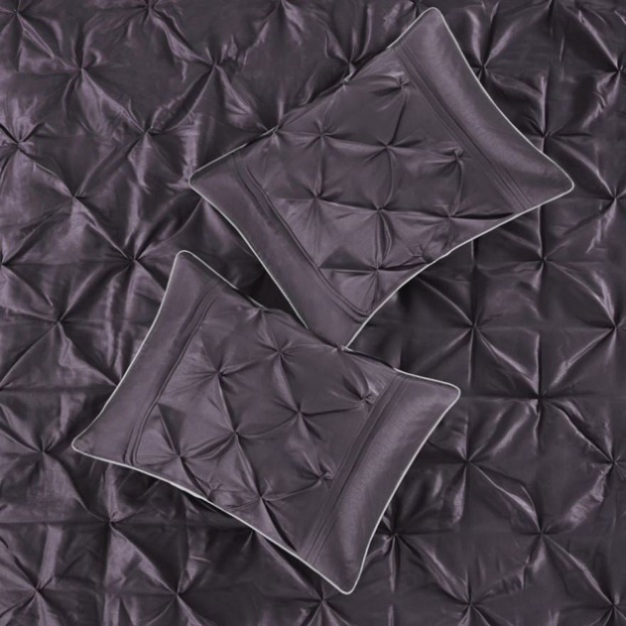 This beautifully tufted bed is from the Laurel bedding collection. Its deep plum coloring makes this set create a statement in your bedroom. The collection is made from 100% polyester polyoni and has pieced fabric sewn together to give this set dimension. It is finished with a smooth edge of fabric that creates a beautiful border around this comforter. Items in the set may come in a rolled or compressed packaging, which will need to be fluffed up or steam ironed before use to remove wrinkles.