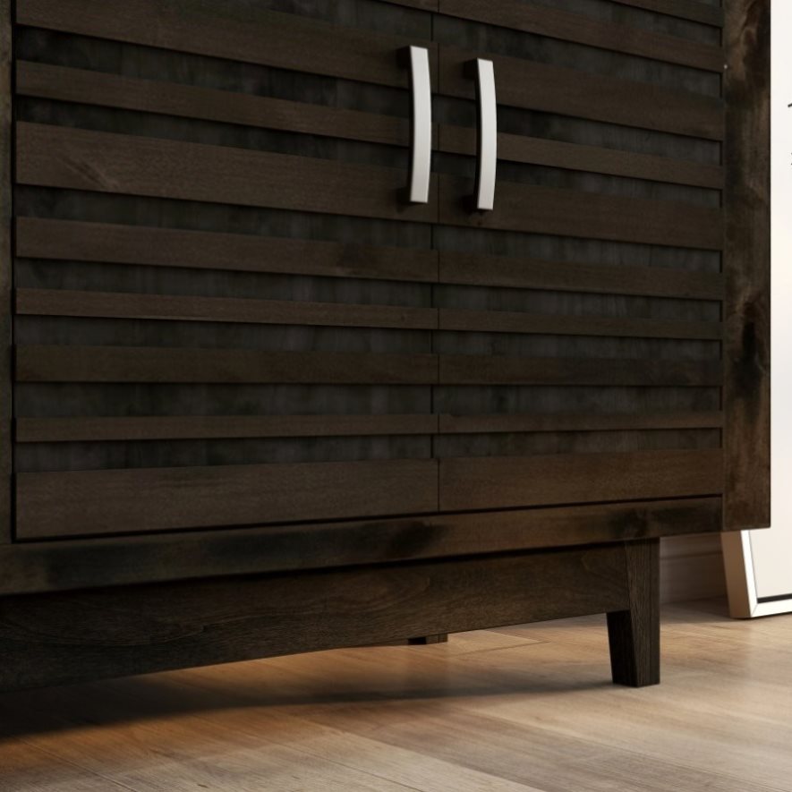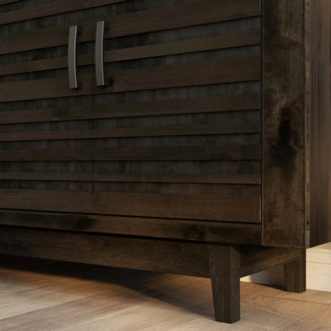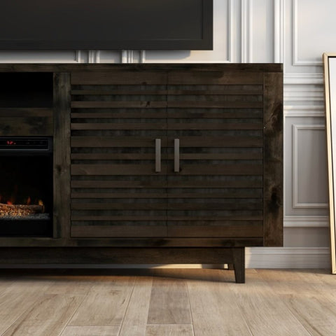 Give your living room a modern upgrade with this 83 inch Electric Fireplace TV Stand. The perfect blend of minimalist, Scandinavian design with a slightly gritty, urban feel, this fireplace TV stand is adeptly crafted from Knotty Alder solids and veneers in a heavily distressed, dark Charcoal- Brown finish and Brushed Nickel hardware and tapered leg. Featuring two shelves and two doors accented with horizontal slat details, this fireplace entertainment center will accommodate TVs up to 95 inches and provide ample storage for media and gaming consoles and home décor favorites. Cable management openings on the back panel will keep every cord and wire concealed. The 42 inch electric fireplace insert includes a remote control and multiple settings allow for heat up to 400 square feet. Four (included) screws make securing the fireplace insert to the console quick and simple.