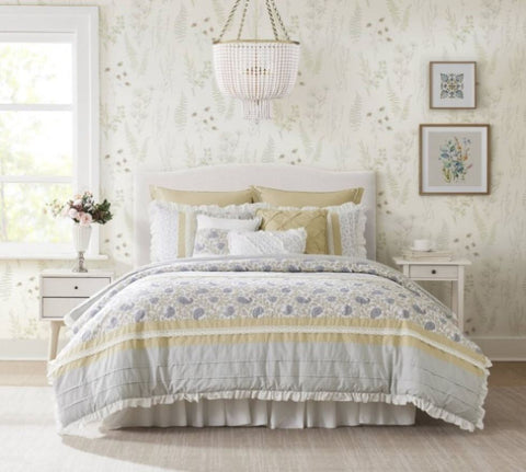 The Madison Park Dawn 9 Piece Cotton Percale Comforter Set offers a shabby chic update to your bedroom decor. A paisley print is featured on the cotton comforter with pintucked fabric separated by lace taping embellishments. Around the edge, a ruched flange adds a graceful touch, for a charming cottage look. Matching shams mirror the design of the comforter, while two solid Euro shams complement the top of the bed. Three decorative pillows and a solid bedskirt complete this farmhouse comforter set. This bedding set is also OEKO-TEX certified, meaning it does not contain any harmful substances or chemicals to ensure quality comfort and wellness. A coordinating shower curtain is available and sold separately. Items in the set may come in a rolled or compressed packaging, which will need to be fluffed up or steam ironed before use to remove wrinkles.