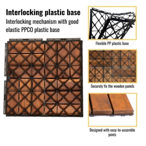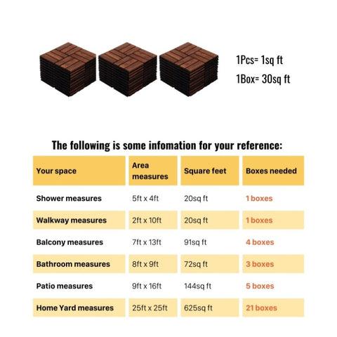 Perfect Size: Each tile has a square shape of 12 inches x 12 inches with 0.75 inches thickness. The wood part is 0.47 inches thick and the plastic part is 0.28 inches thick enough for drainage during the rainy season.