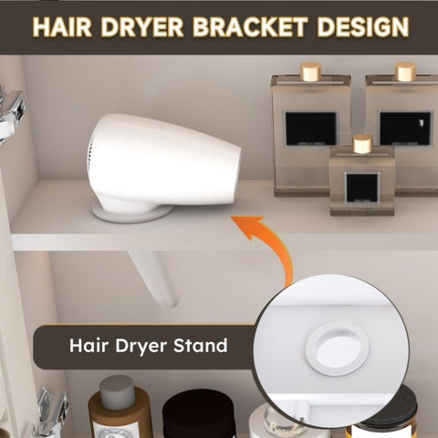 The hidden storage area includes a hair dryer storage hole to prevent the hair dryer from getting damp and damaged.