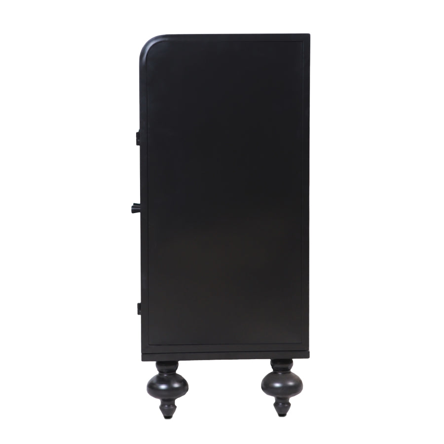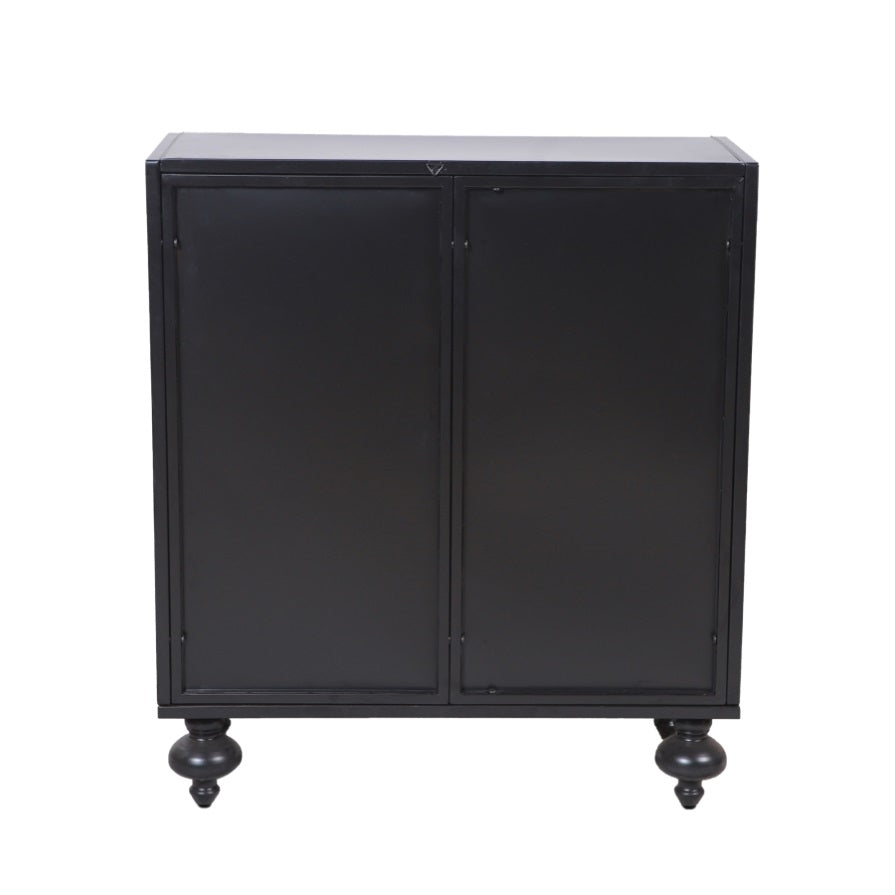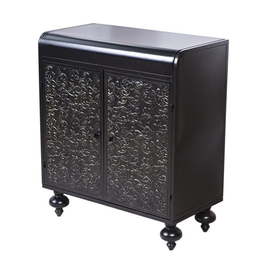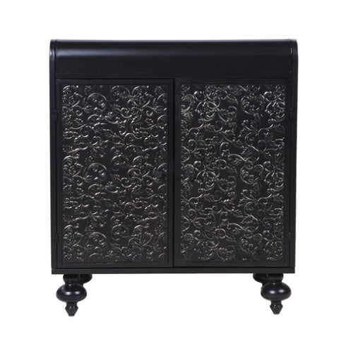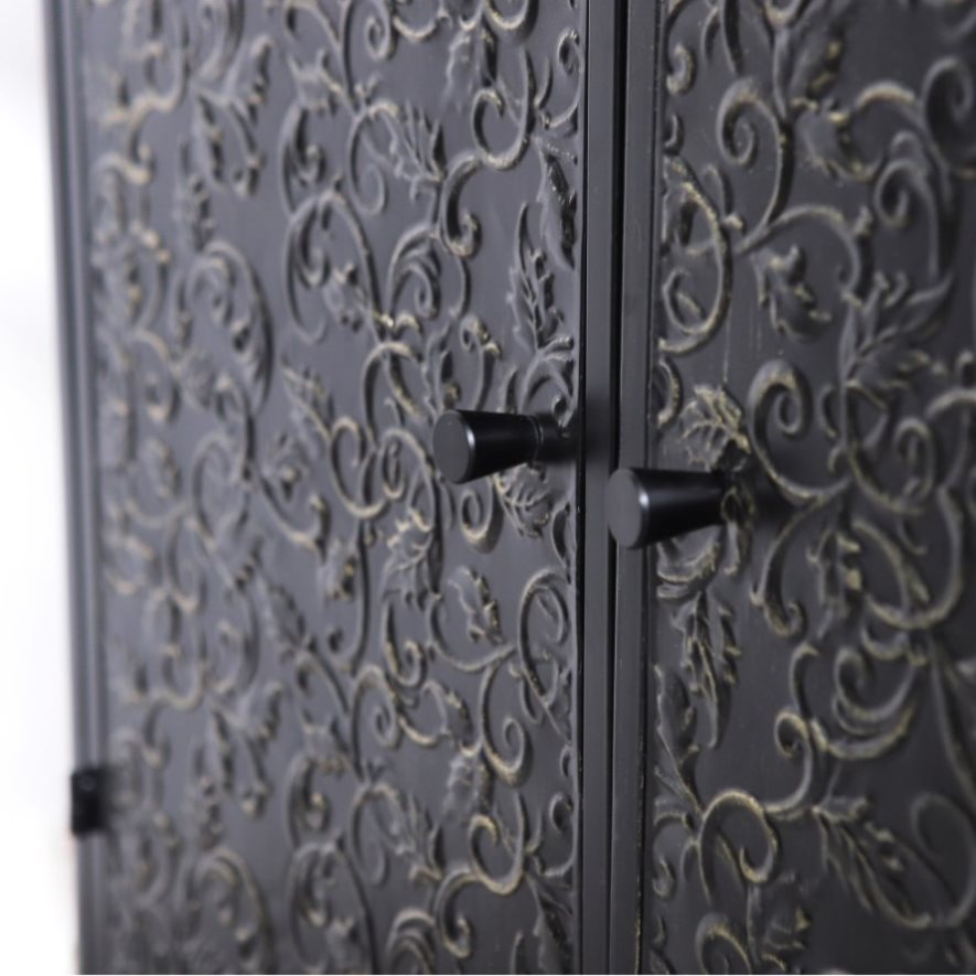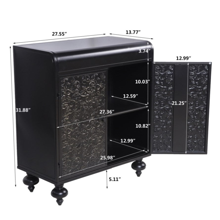 1.Design & Aesthetic Appeal. This accent cabinet blends rustic elegance with timeless charm, featuring intricate carvings, distressed finishes, and vintage designs. It adds a unique decorative touch. The overall black color with golden accents can seamlessly integrate into various interior styles, from farmhouse to modern chic.