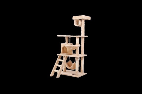 Multiple-use Cat House There is a specially designed, multi-layer structure for cats to scratch, climb, sleep, and exercise. It features three perches for easy jumping, two cozy fluffy hammocks for stretching, sisal-wrapped scratching posts with hanging play balls, and a spacious condo for luxurious napping.Furthermore, Two ladders are added to enhance the play scene for your lovely cats.