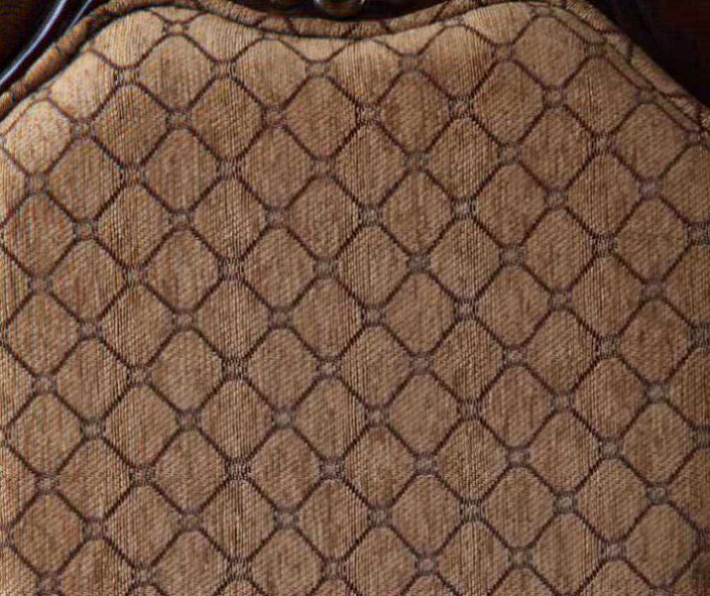 Padded SEAT & BACK: Fabric Cushion with Welt-Trim (Grid Pattern), Arched Backrest: Fabric, Wood Trim with Raised Motifs, Wooden Apron Seat: Molding Trim