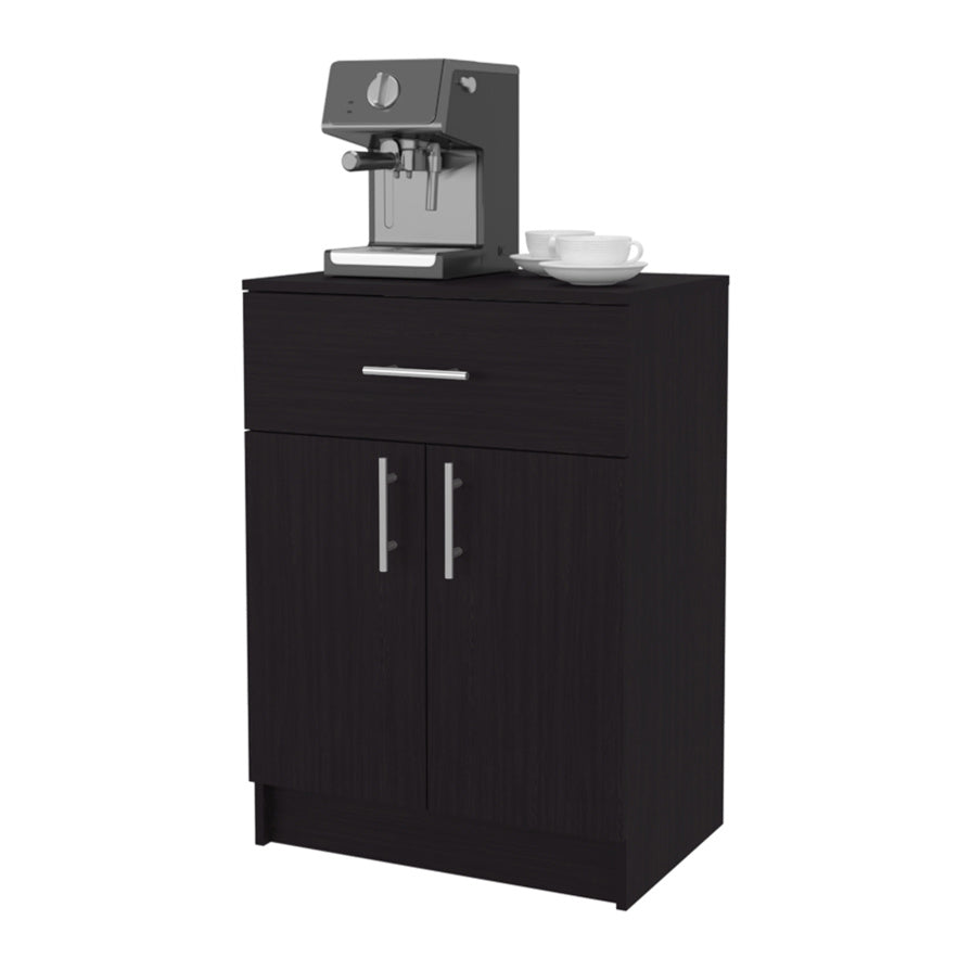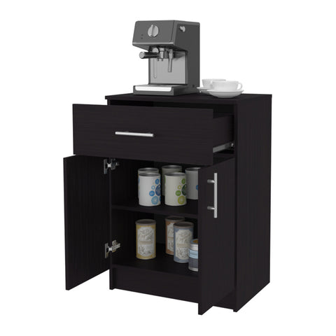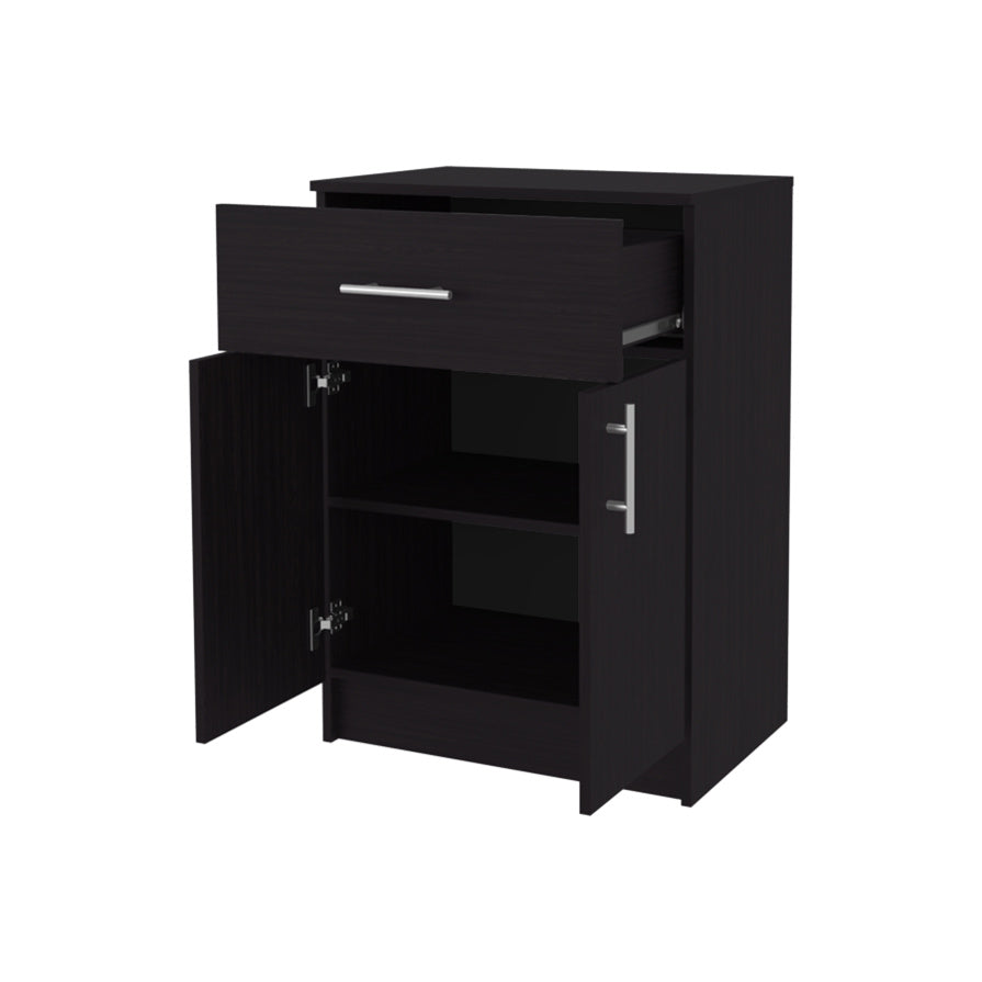 This pantry cabinet is an ideal storage solution for organizing your kitchen. With a compact and functional design, it features a drawer and two doors, offering ample space to store utensils, food items, and other kitchen essentials. Made from melamine and particleboard, it ensures durability and sturdiness. Measuring 23.6 inches wide, 33.5 inches high, and 15.9 inches deep, it is perfect for small spaces without compromising on storage capacity.