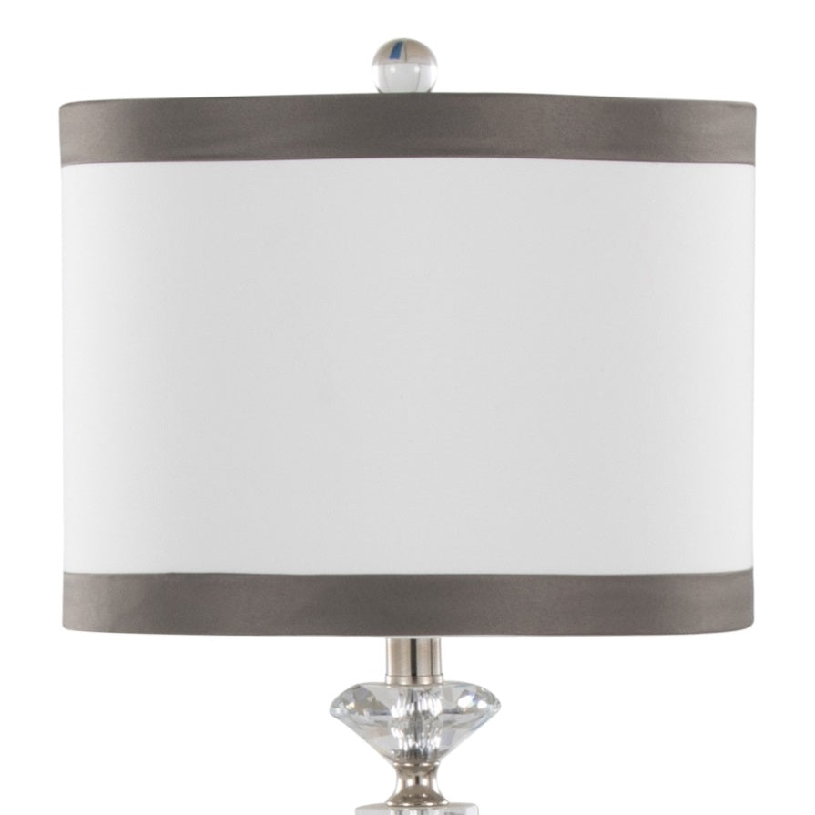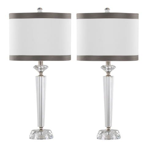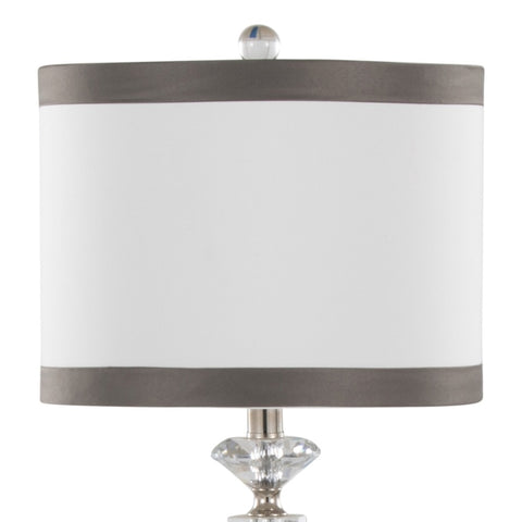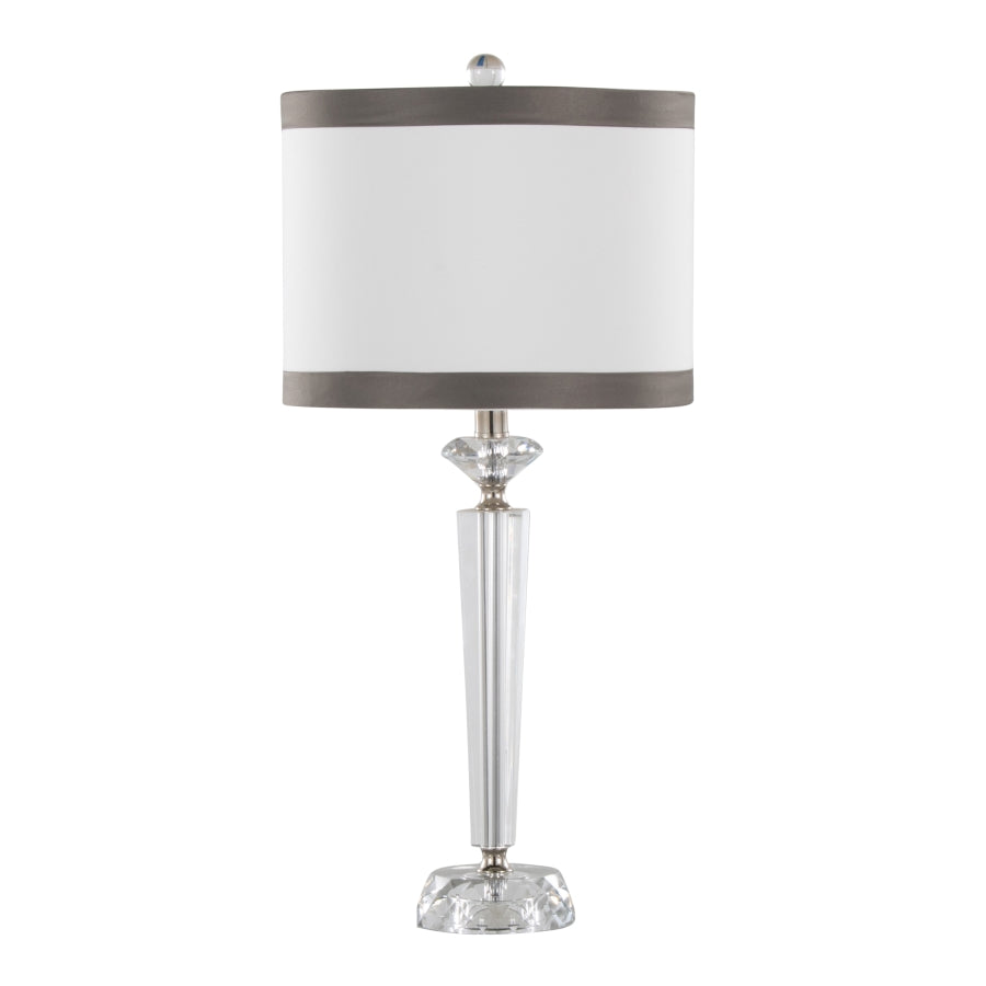 Add some luxury to your life with the Diamond Torch Table Lamp from Grandview Gallery by LumiSource. Its unique faceted round base supports an elongated, tapered crystal piece and a diamond-shaped crystal. Topped by a luxurious linen shade and a crystal finial, this table lamp set will add a touch of modern glamour to any space. Whether resting on your nightstand, set up in the living room, or glamming up the office, these table lamps are the stylish solution to your lighting needs.
