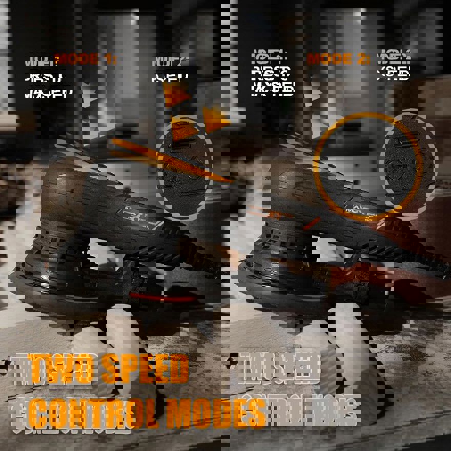 Achieve optimal sanding results with our sanding machine's two-speed control modes. In Mode 1, the Speed Throttle lever allows you to adjust the speed to the maximum level of each setting. In Mode 2, the rpm+/rpm- function offers six levels of fixed speed, giving you precise control over your sanding speed for different applications