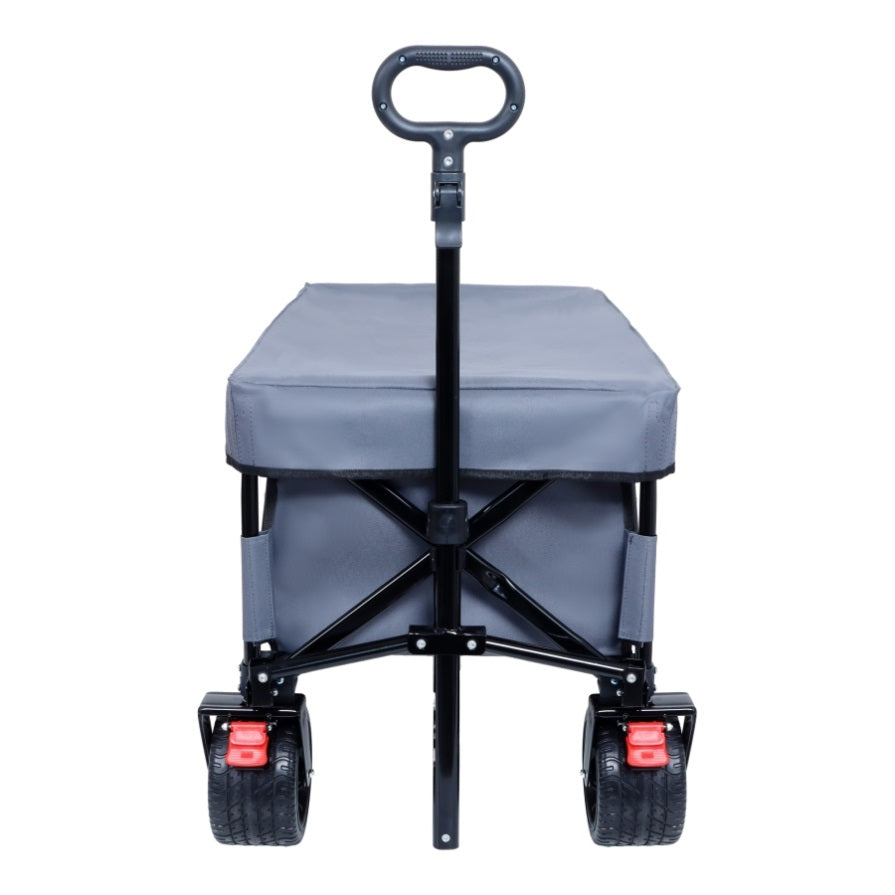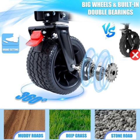 Smooth Handling and SafetyThe camping handcart is designed for smooth and comfortable use. The adjustable drawbar allows you to pull and steer the cart with ease, ensuring it stays at a comfortable height while remaining clean. Additionally, the two wheel brakes on the 360° swivel wheels provide added safety and control, especially on sloped terrain or when stopping near your car. The large, wide wheels are ideal for various surfaces, including sand and gravel, rolling smoothly and quietly.