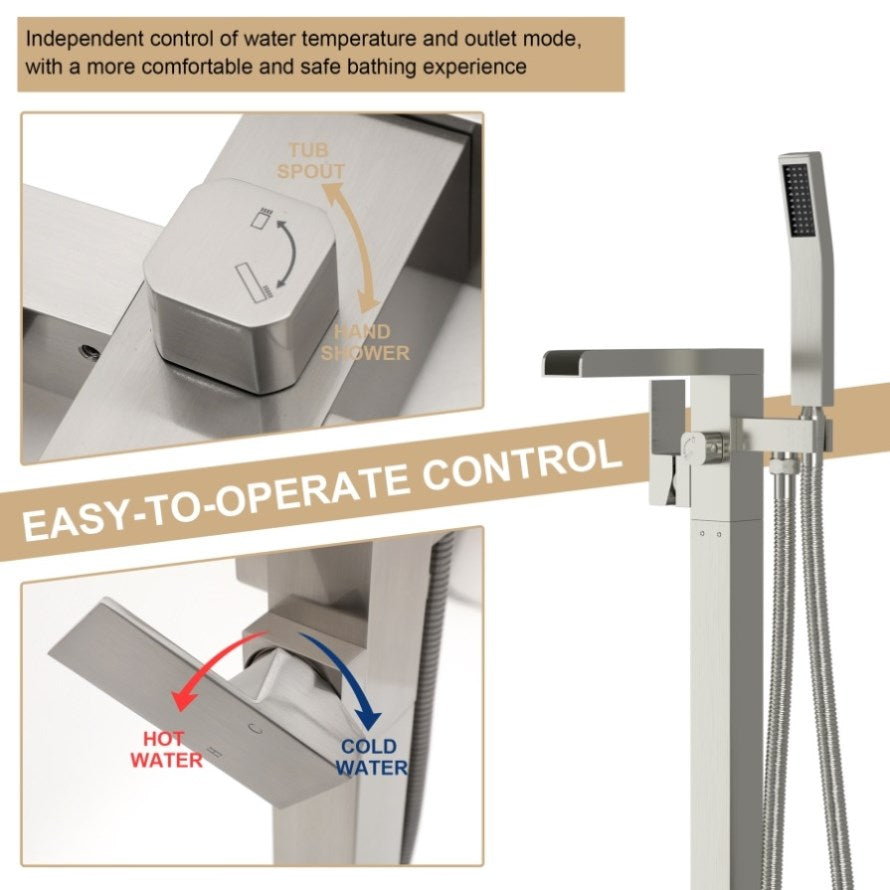 [Dual Control for Precise Temperature & Outlet Selection] Independent hot and cold water knobs provide full temperature control for a customized, comfortable bath. Easily switch between the waterfall tub spout and handheld shower with the convenient outlet mode selector.