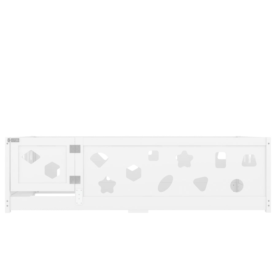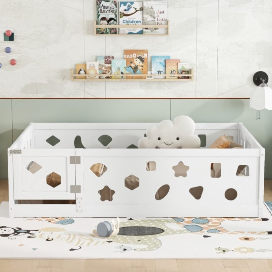 Combining practicality and creativity: This floor bed adds a unique and playful feeling to the child's room. The Fence with geometric shapesdesign enhances safety while stimulating imagination and creativity. This affordable bed integrates sleep and decoration, creating a multifunctional space that children will love.