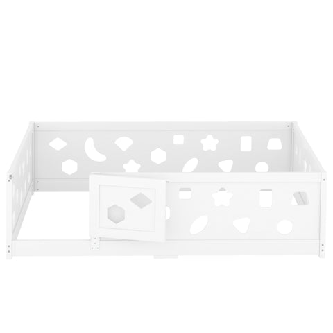 Full Size Floor Bed with Heightened Safety Guardrails and Door, Solid Wood Bedframe with Rails for W1820P240541
