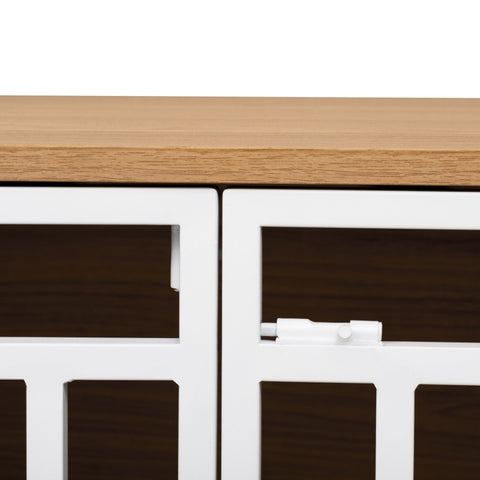 PET FRIENDLY DESIGN: The cabinet doors are adorned with white geometric - patterned frames, which not only act as an eye - catching decorative element but also suitable for small&medium size dog,is a perfect living and sleeping area for small&medium size dogs. With a touch of privacy behind the uniquely designed doors, it offers a cozy nook where your furry friends can rest and feel secure.