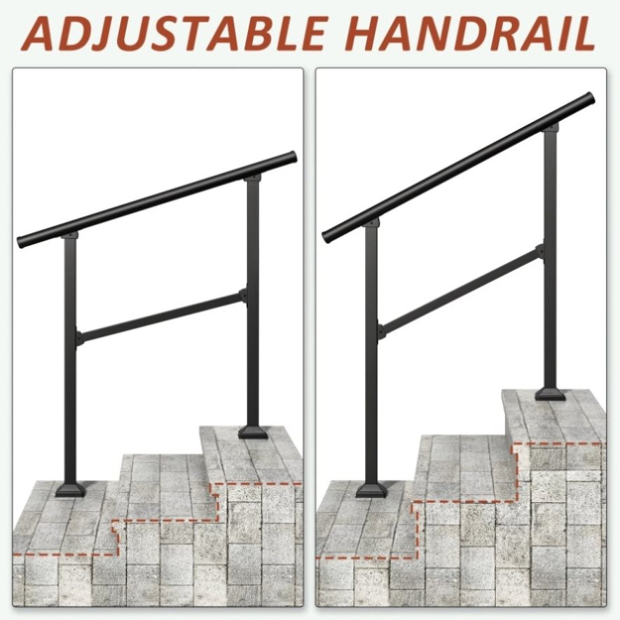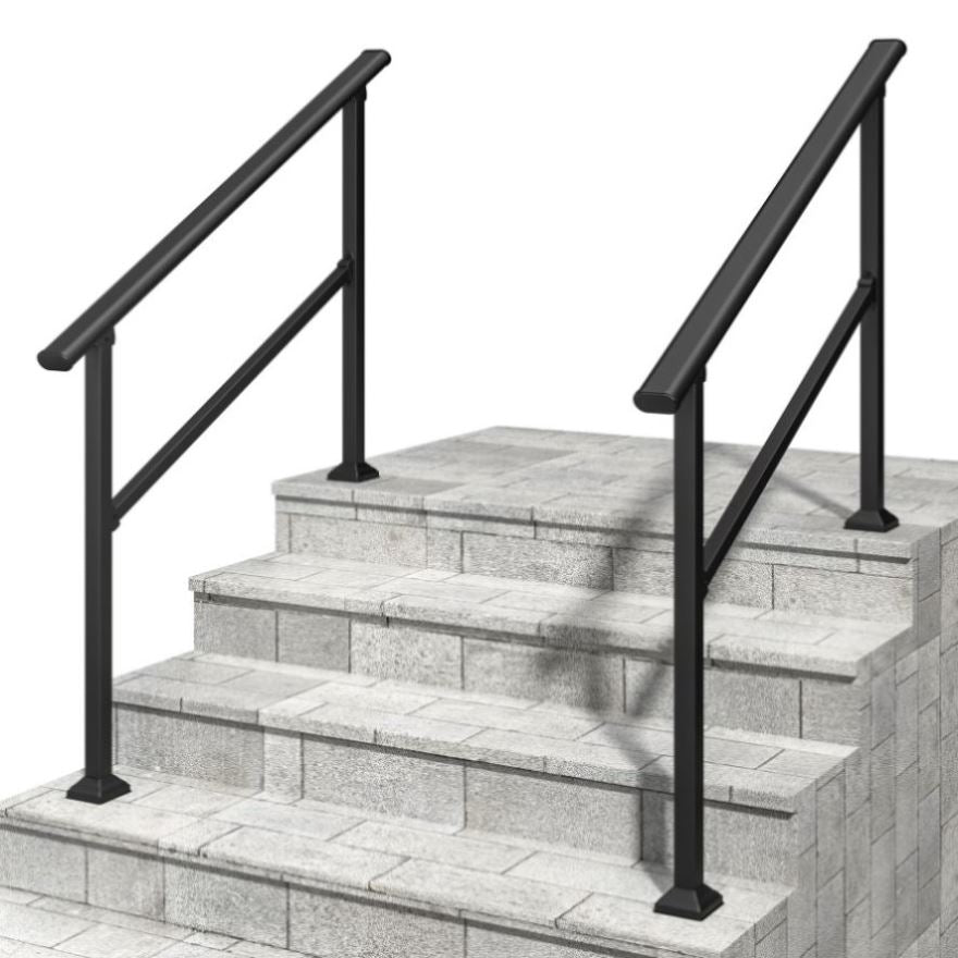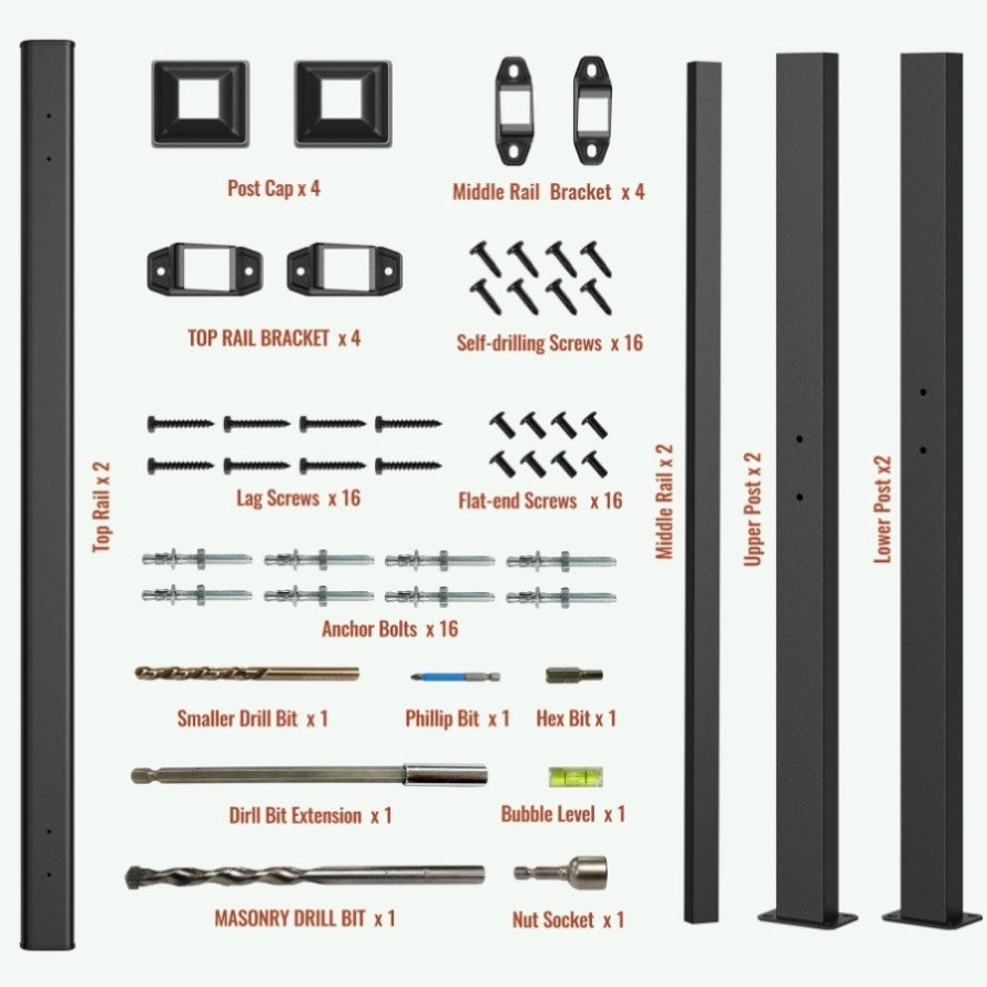 With a powder-coated surface, the handrail are sturdy, durable and non-slip that can withstand the elements and abuse from scrapes and dents.Comes with assembly manual, all the drill bits, hex drivers and screws for installation on both wood and concrete.