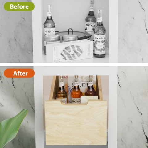 We understand that one size does not fit all. Therefore, we've designed this 8-inch tall pull out drawers with doubled side and back heights, forming a wrap-around shield to prevent taller items from toppling off your shelves. Perfectly engineered for double stacking cans in your pantry, 8-inch tall birchwood rim in a tapered shape to firmly secure larger items