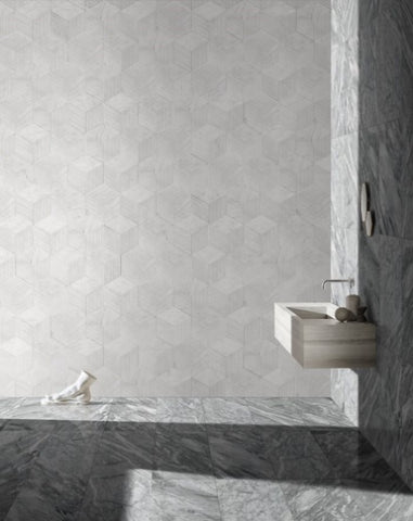 The wall in the middle is made of Hexagon Snow Mountain White OL textured finished marble tiles W1696P262342, the floor and other side wall are made of 12X24" Carrara Gray polished marble tiles W1696104353.