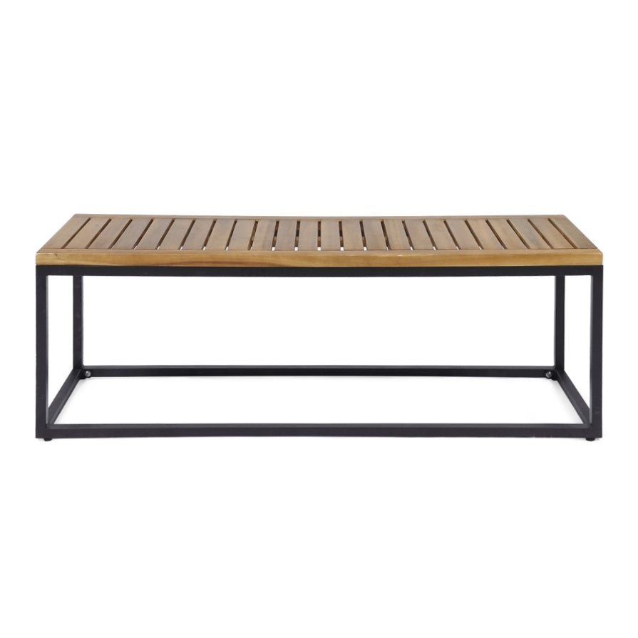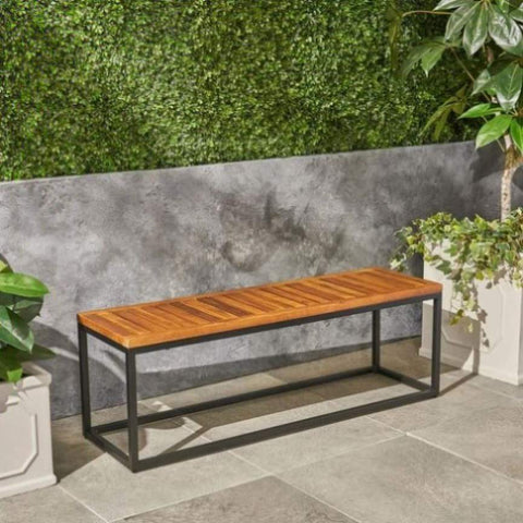 Impart your backyard patio or garden area with a sense of scholarly culture with this contemporary outdoor bench that will not only allow your guests to rest at their leisure, but will also bring with it an atmosphere of somber, architectural elegance. Its iron frame and closed legs complement a slatted acacia wood surface with graceful ease, making this selection the epitome of chic, modern grace.