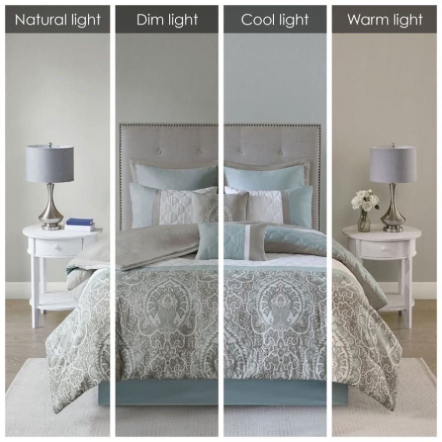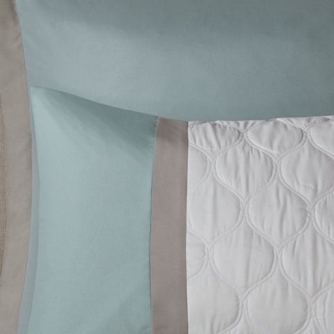 Set includes comforter, seafoam bedskirt, 2 shams, 2 seafoam euro shams, 1 oblong and 1 square pillows