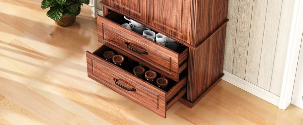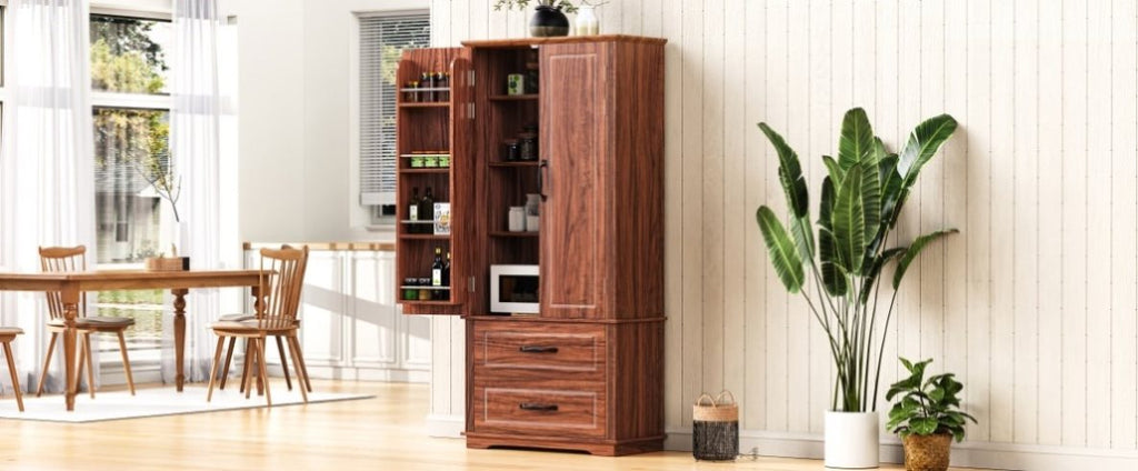 [Spacious Storage Solution] Boasting 6 storage compartments with 3 adjustable shelves, 2 full-extension drawers, and 8 door shelves, this pantry cabinet from us offers ample storage for your food, dinnerware, and kitchen appliances, keeping your space organized and clutter-free.