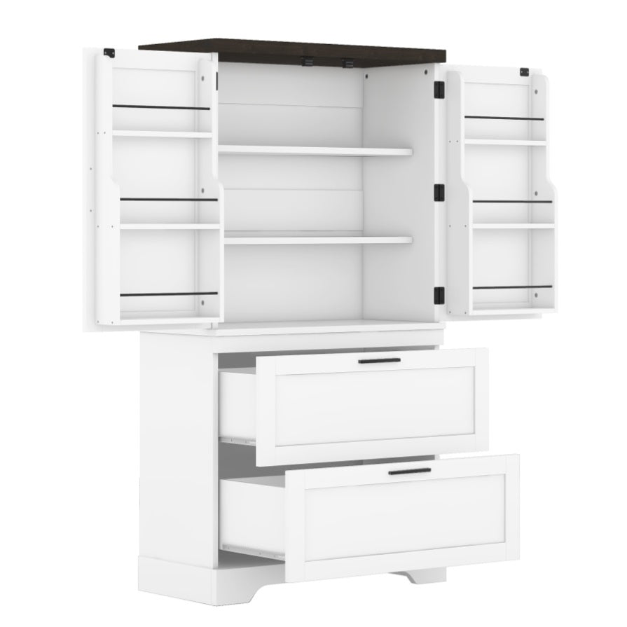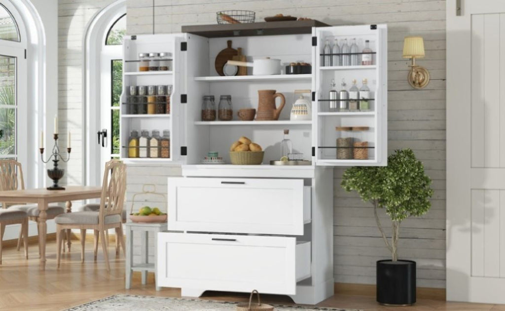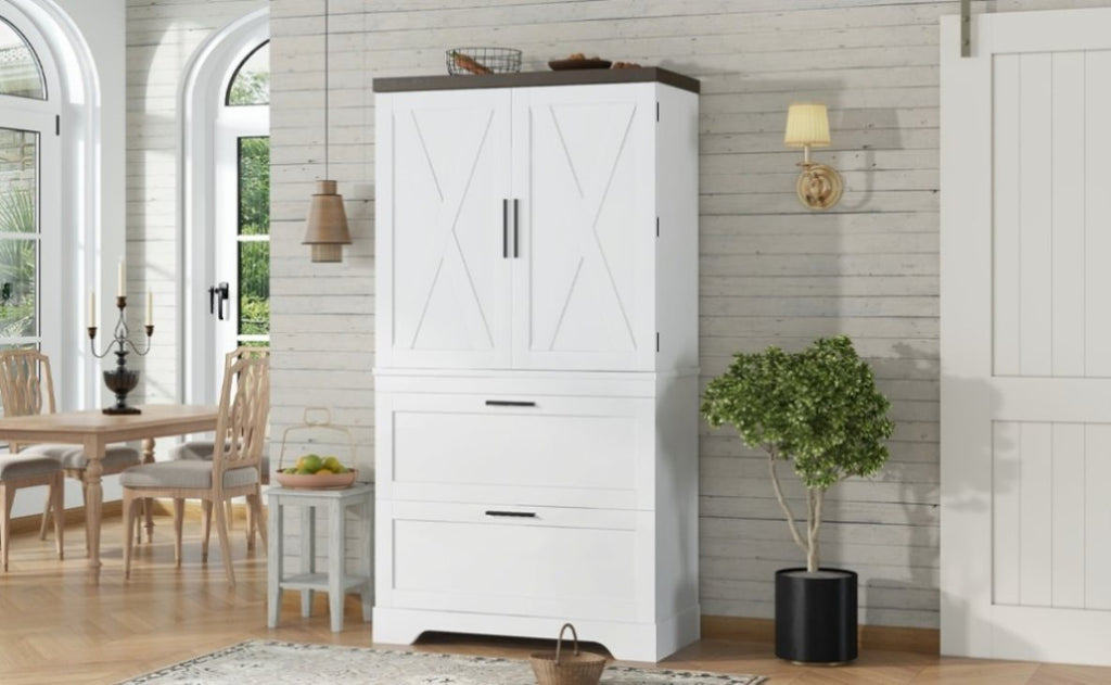 [Convenient & Convenient]: This farmhouse style storage cabinet greatly increases the storage space in your home. The farmhouse style X-shaped barn door features storage shelves on the inside of the upper part of the door for bottles and cans, and 2 large storage drawers on the lower part for easy opening and closing and convenient storage.