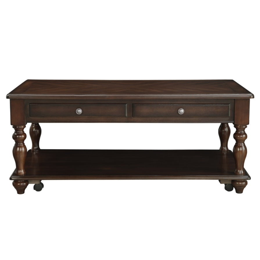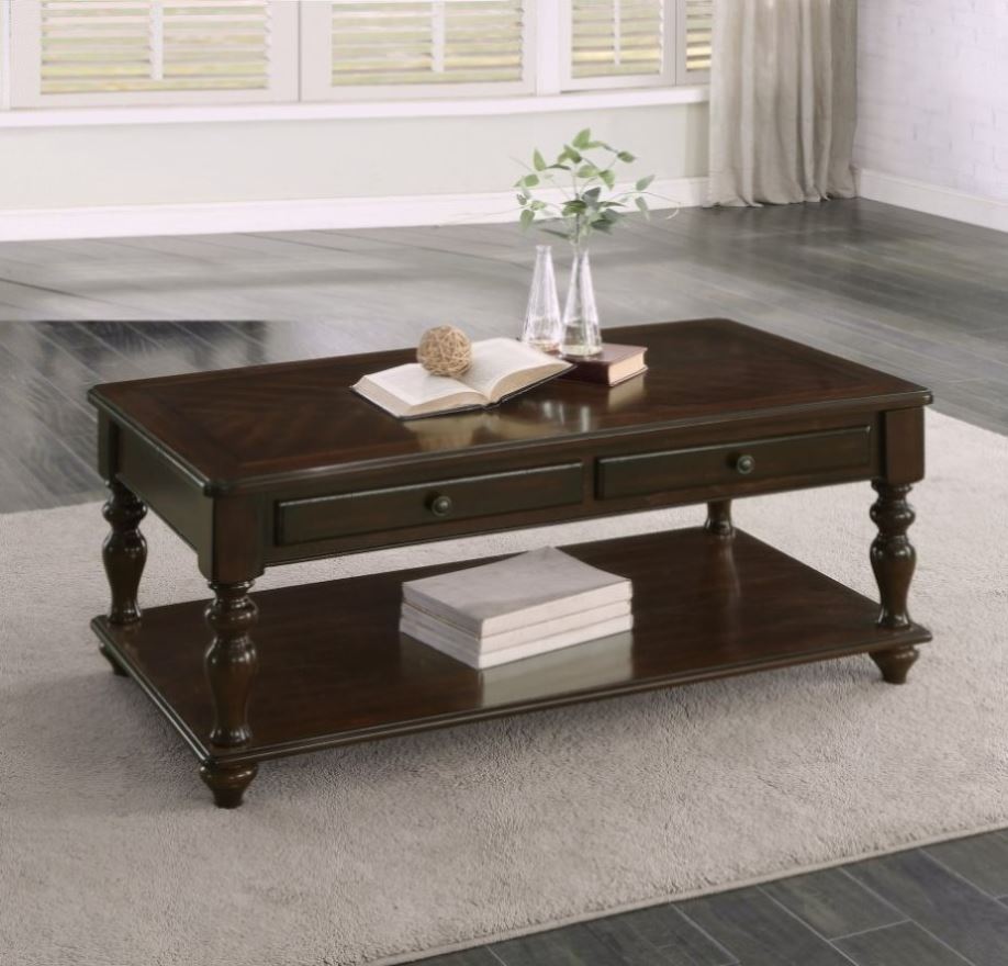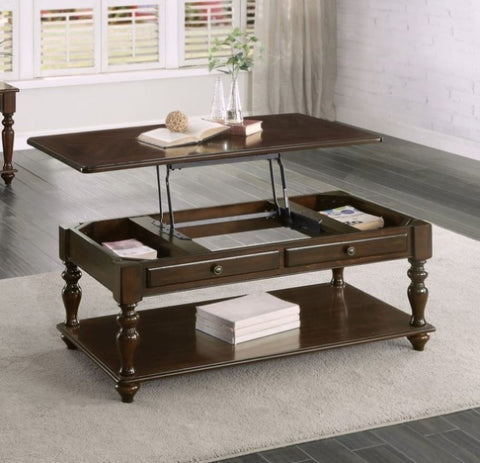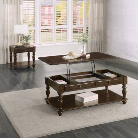 Turned legs provide support to the tabletops and display shelves of the Lovington Collection. Modern traditional styling of the caster-supported lift-top cocktail table is achieved with a blend of classic accents – turned legs, knob hardware, espresso finish, and creative functionality. Each of these elements combines to create a stylish look for your home’s living room. Coordinating end table is also available. PRODUCT DIMENSIONS: Overall Dimension: 48" x 26" x 20"H Listing Includes: One Cocktail Table Only. End-Table: Not included Simple Assembly Require.