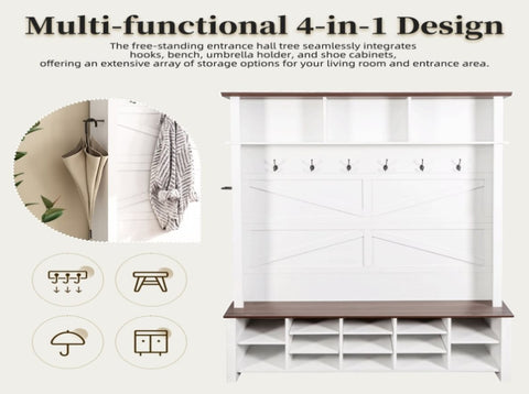 Multi-functional 4-in-1 Design: The free-standing entrance hall tree seamlessly integrates hooks, bench, umbrella holder, and shoe cabinets, offering an extensive array of storage options for your living room and entrance area. The unit features a convenient side umbrella rack, perfect for hanging your umbrella, keys, and other essentials.