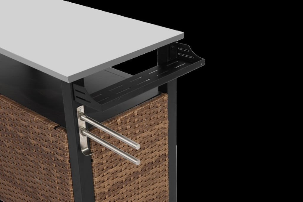 This rattan outdoor kitchen table features a solid steel frame that's covered in weather-resistant handwoven wicker; Stainless steel countertops are better for outdoor use; Can withstand diverse weather conditions to achieve long-lasting use