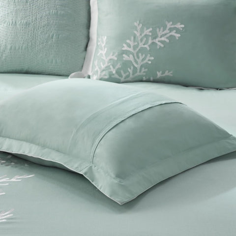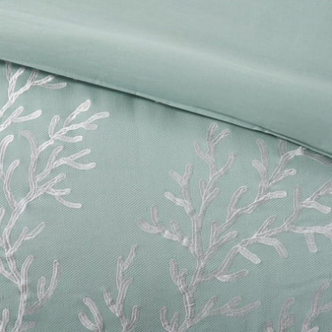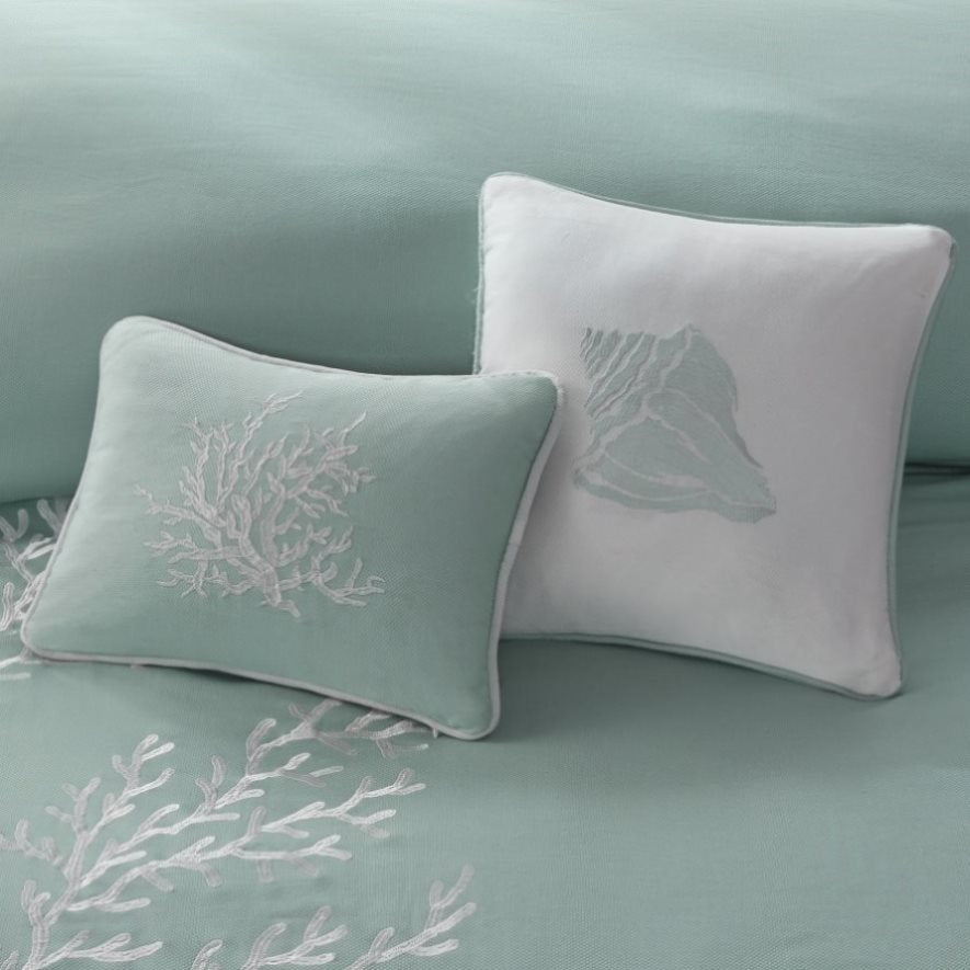 Bring a bit of sea side inspiration into your home with this beautiful bedding collection. The Harbor House Coastline collection features an intricate white coral motif embroidered on an aqua background finished with a pieced white border. Oversized and overfilled, this comforter set is made of 100% cotton with polyester filling and offers warmth and comfort to your room. Included in the set is one comforter, one border-style bed skirt, and two shams (1 for Twin size). Top off the look even more with the accessory items - Euro shams and decorative pillows which are sold separately. For best care, dry clean the comforter, shams, and bedskirt. This bedding set may come in rolled or compressed packing and will need to be fluffed up.