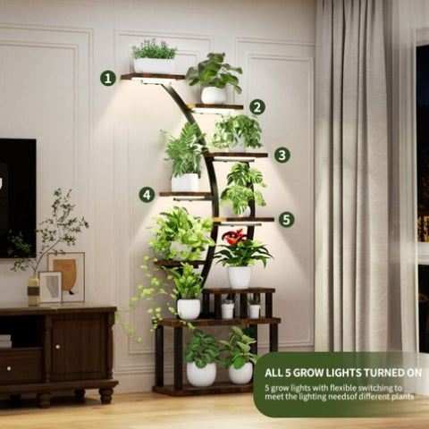 9-Tier, 63" Elevated Plant Stand This 63.6" plant rack with increased height features 9 tiers, 9 pot stands, and 5 LED light, providing you with ample storage space to display plants as much as possible. In addition, it can also serve as a display shelf for placing books, pictures, collectibles, awards, small ornaments, artworks, crafts, and more. This tall plant stand will be a creative addition to your home decor.