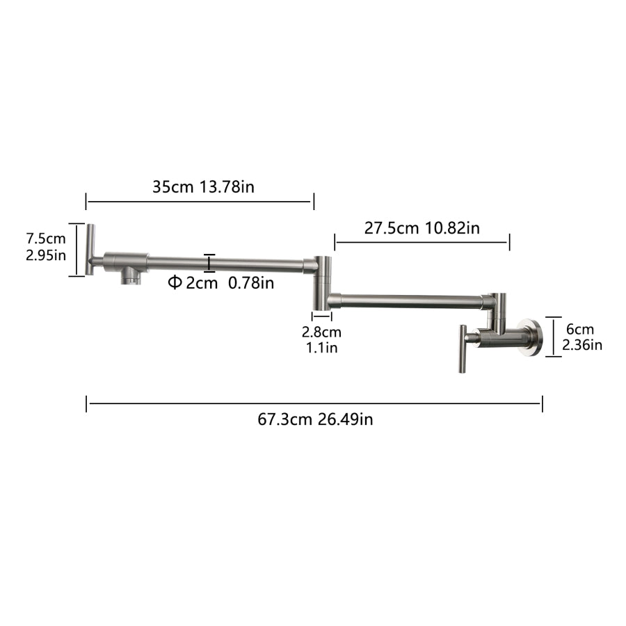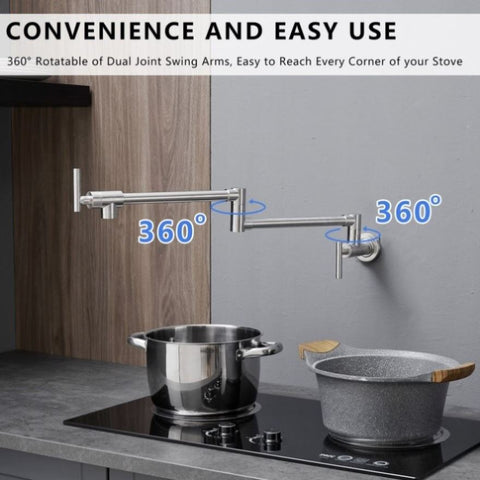 This Pot Filler Faucet arms can be 360° Rotation:Dual Jointed Swing Spout,Use for Only Cold Water or Only Hot Water,One Hole Inlet Wall Mount.
