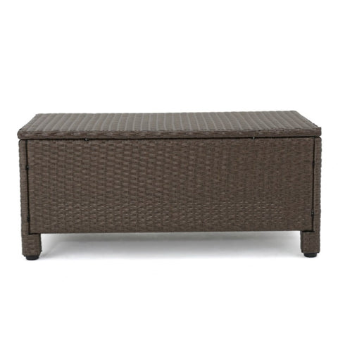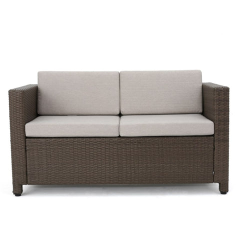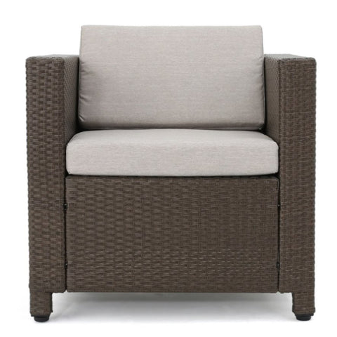 Complete with one loveseat, two club chairs, and one rectangular coffee table, this seating group shows off PE wicker rattan wrapped around an all-weather, water-resistant iron frame.